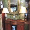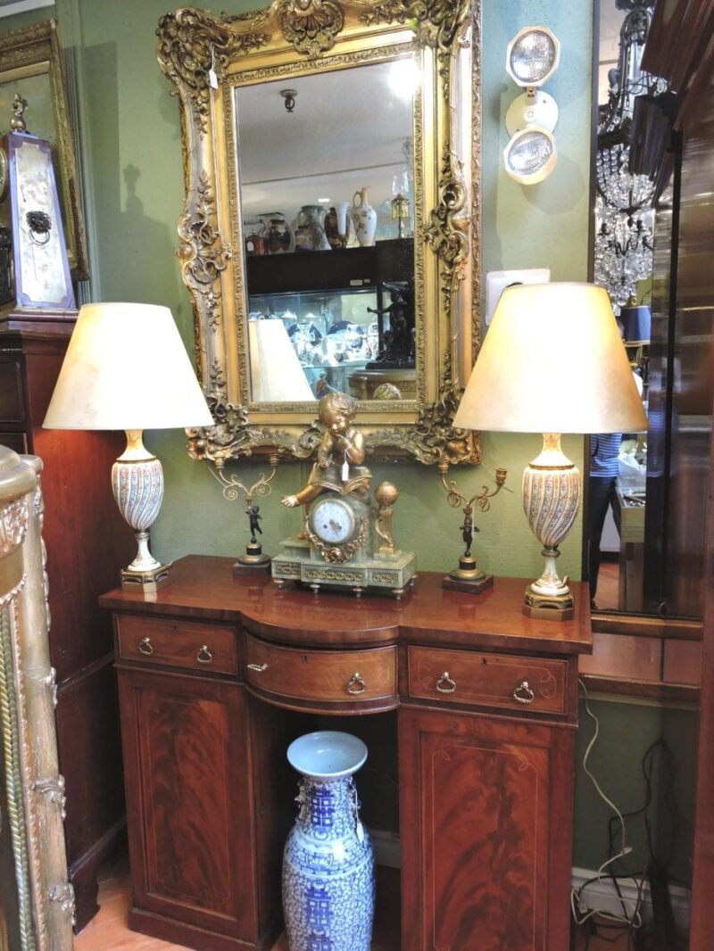 The server has brass hardware and has a lock for each drawer.   A key is provided.  The server comes apart in 3 pieces – 2 side pedestals & the top lays across the pedestals.