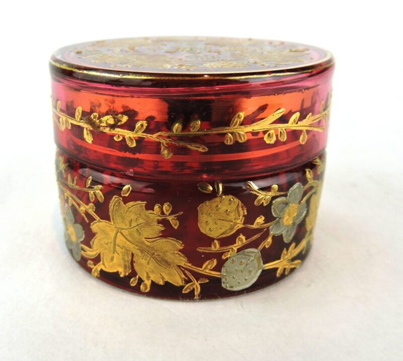 Small Moser Cranberry Glass Covered Box with Elaborate Gilt and Silver Enamel Decoration, c. 1890