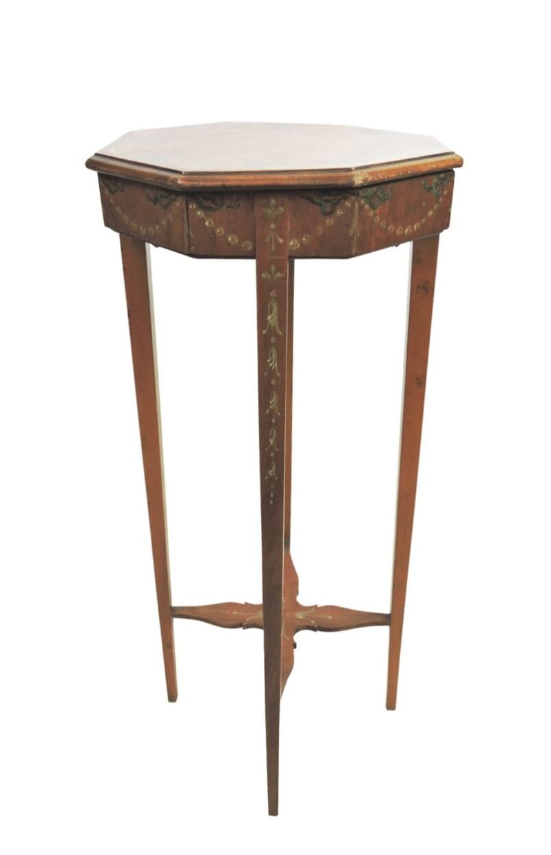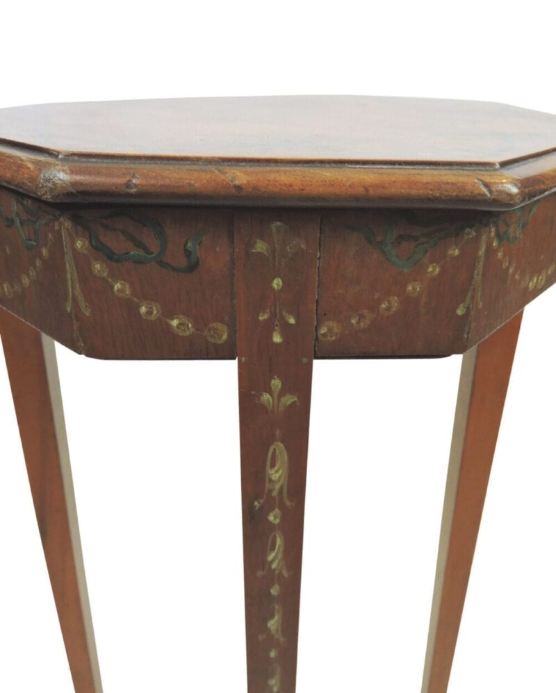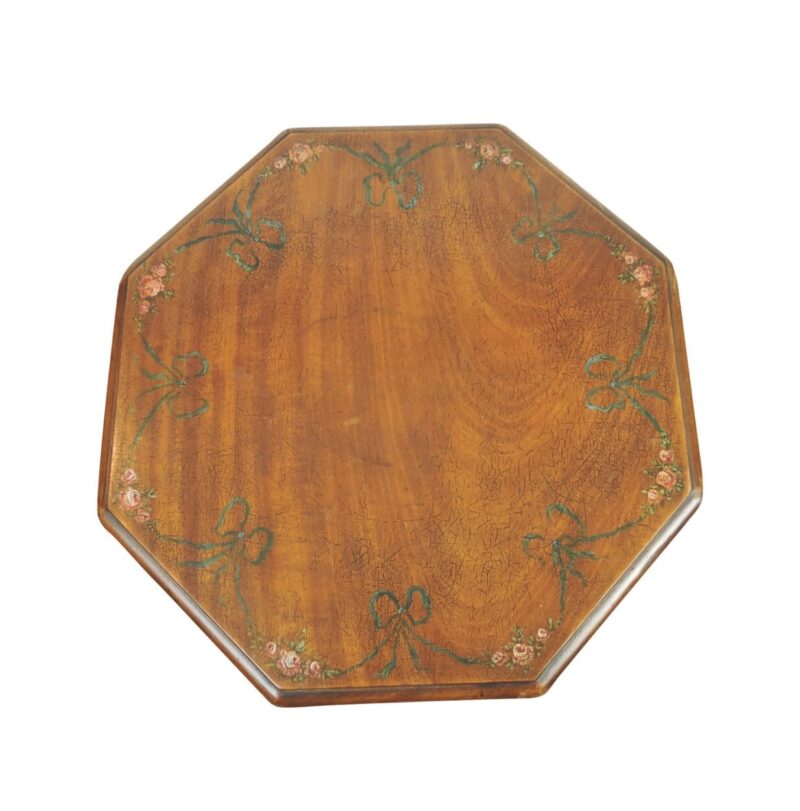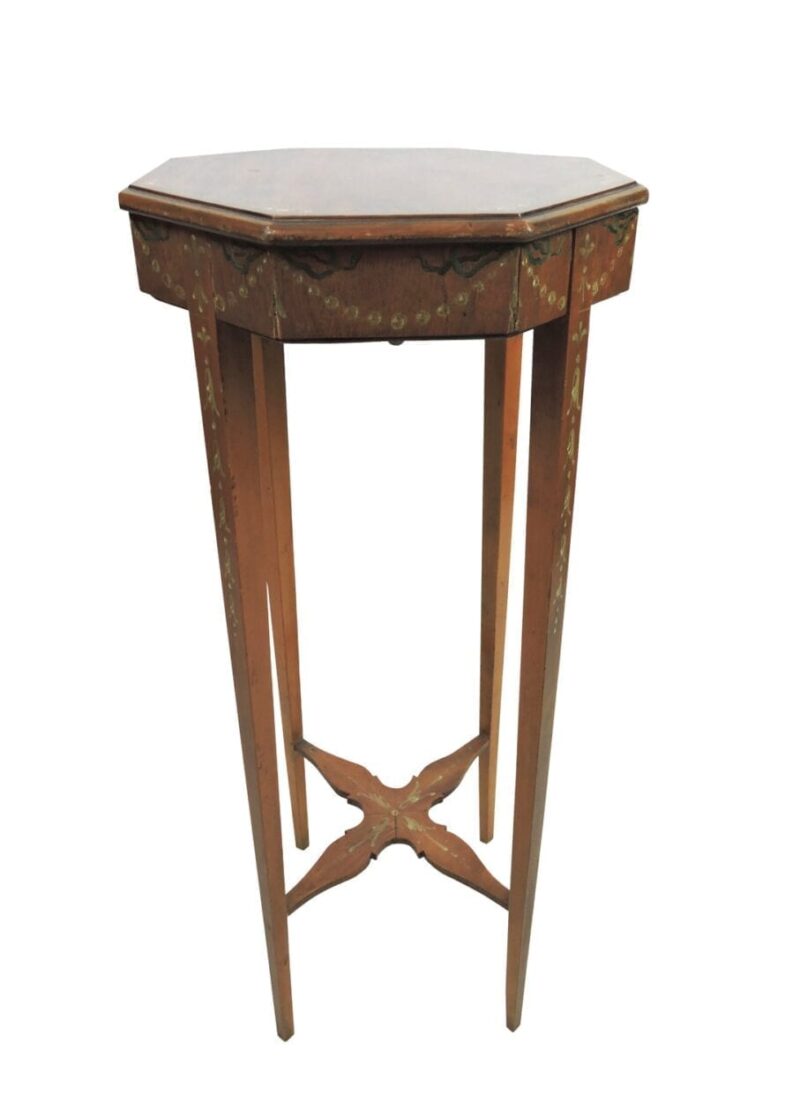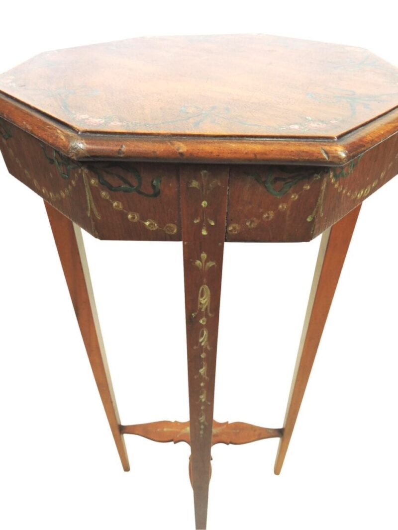 Here is a sweet occasional table in satinwood. The table is octagonal in shape and is hand painted – decorated with bows and flower garlands on its top and has designs around the body, on the cross piece, and down its legs.