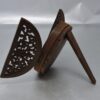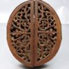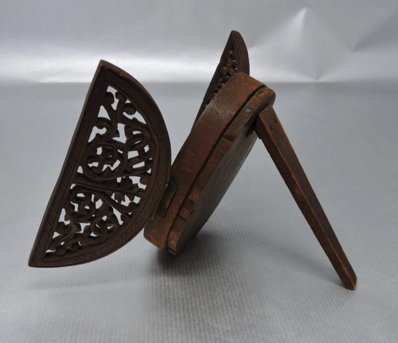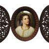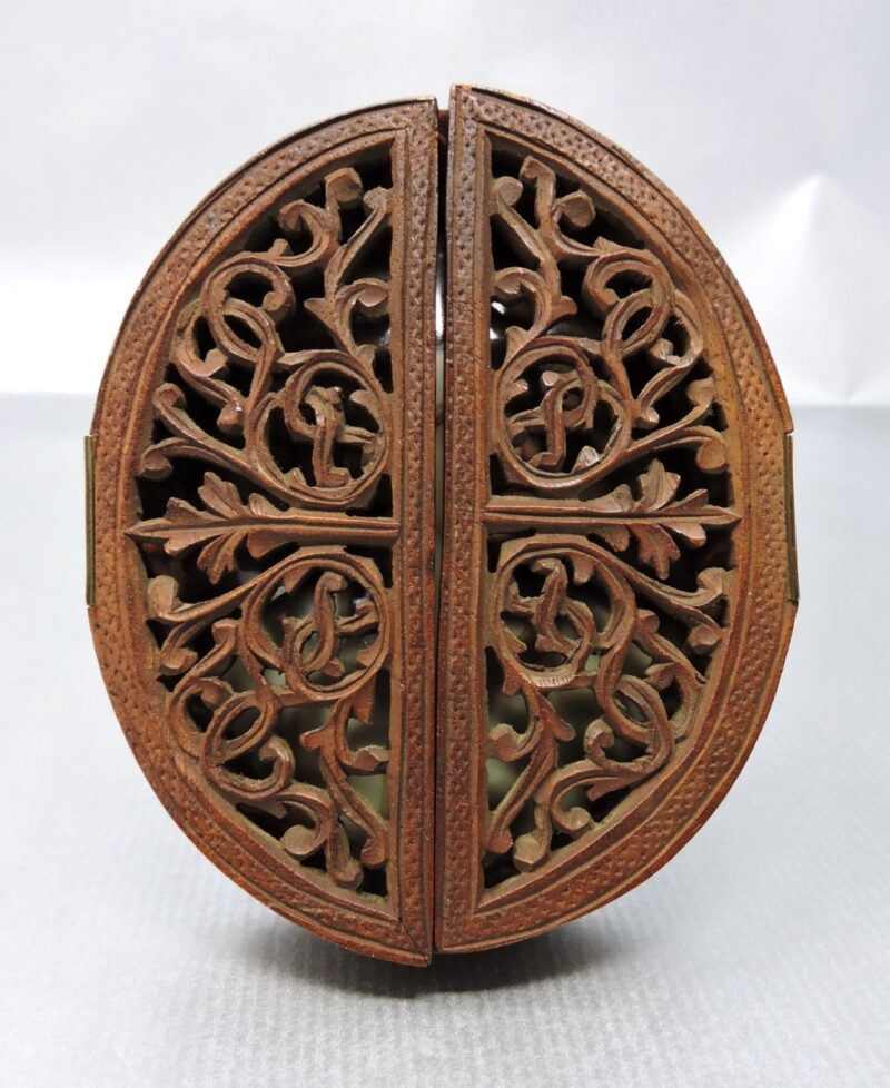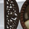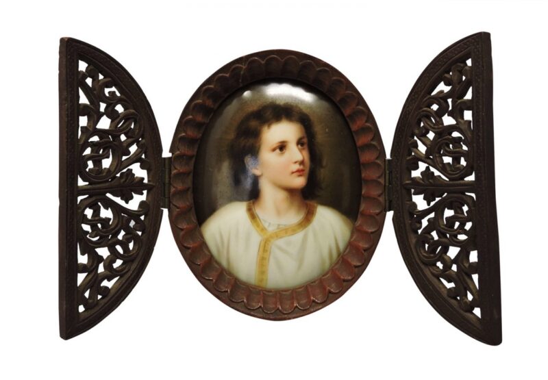 The plaque is housed in a carved 3 part oval wooden frame with an easel backing. The frame has filigree carving on the 2 front sections which are hinged. When these are opened, it reveals the plaque. The frame will stand upright whether the front sections are opened or closed.