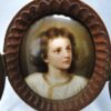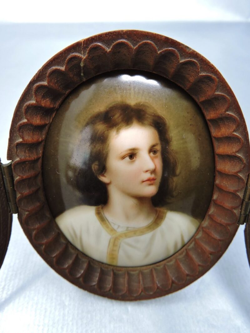 Small Porcelain Plaque of Young Jesus Christ, Housed in a Carved 3 Part Oval Wooden Frame, Easel Backing
