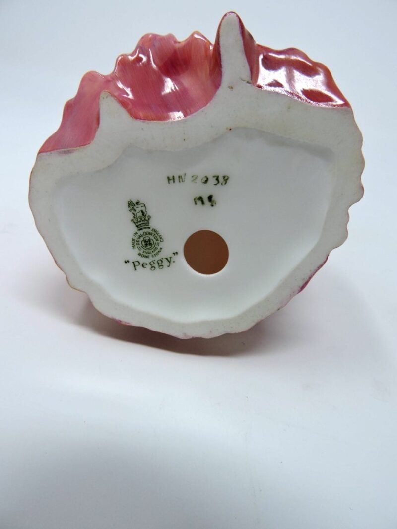 On the underside is the Royal Doulton maker’s mark plus “Made in England. Royal Doulton Bone China”. “Peggy” and the hand-painted numbers “H.N. 2038” and “198”.