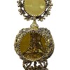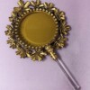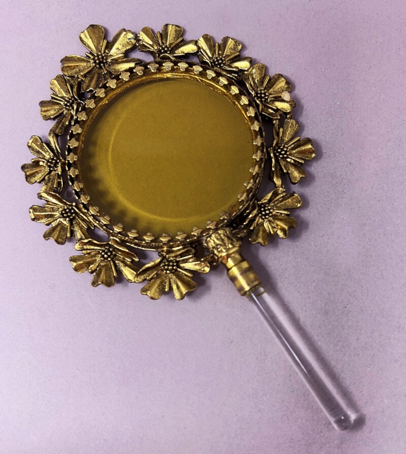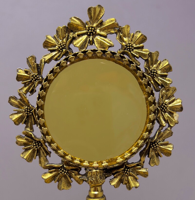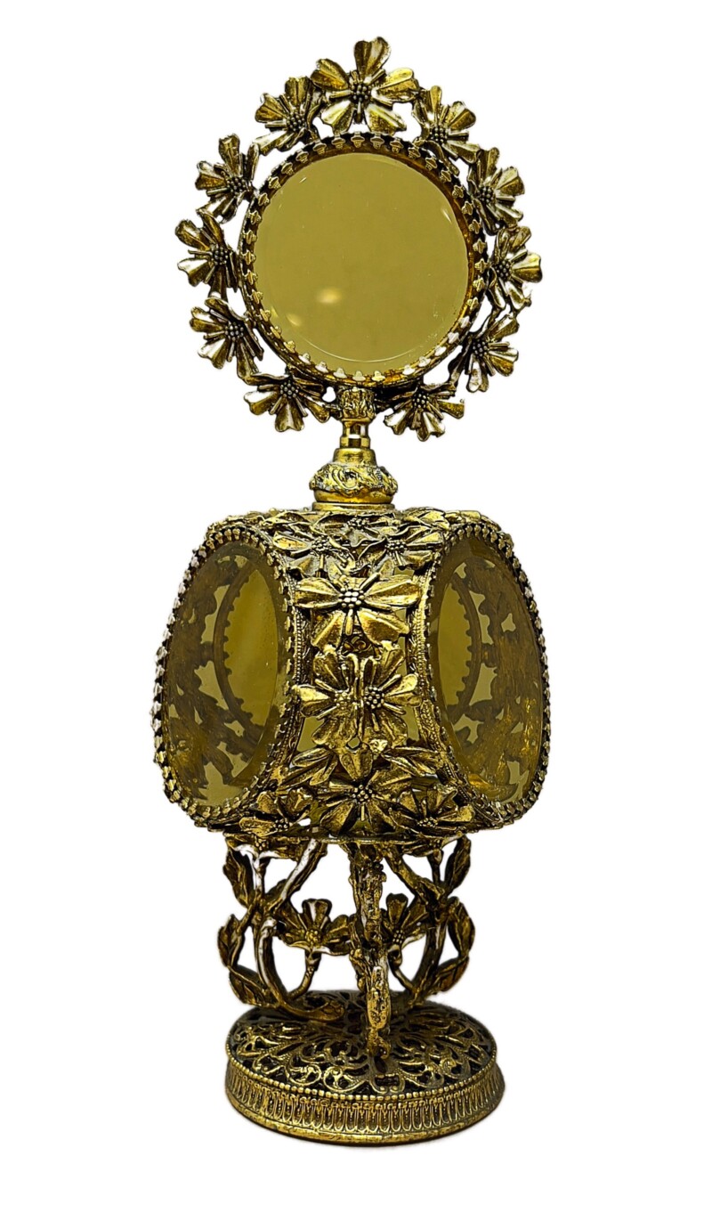 Stunning perfume bottle in a triangular shaped gold ormolu filigree, with a “floral dogwood” motif. The 3 sides are encrusted with textural “flowers ” that wrap around 3 pieces of circular, light cadmium coloured beveled glass. Spectacular repetition of the ormolu filigree design in the base. The large circular glass dauber framed in ormolu filigree shows the beautiful attention to detail associated with dogwood blossoms.  The whole effect is as if  holding a “magnifier” and wondering about the “magic” of design in this piece.
