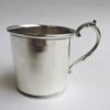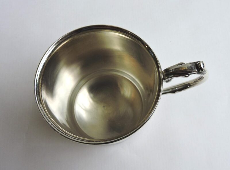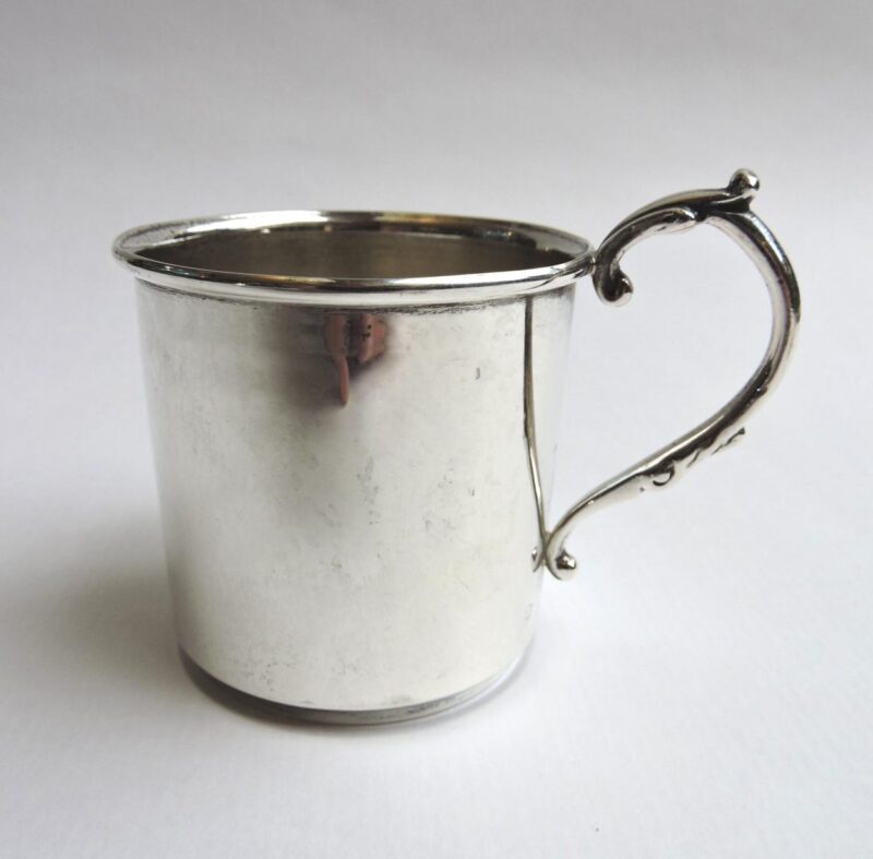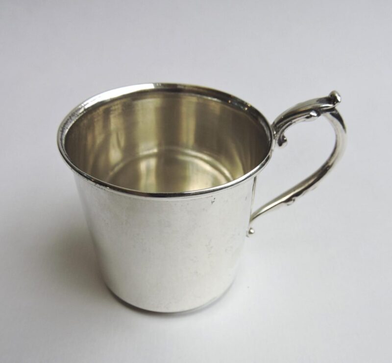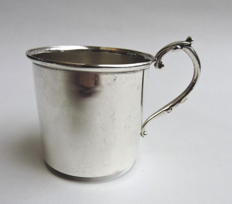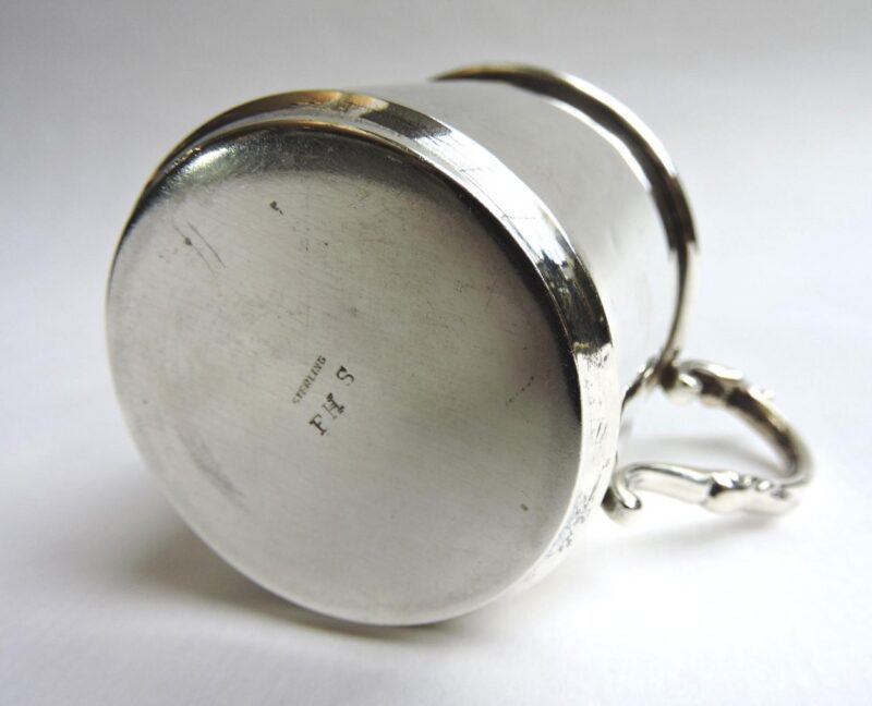 Here is a lovely sterling silver baby’s christening cup, signed “Sterling FHS” on the underside of the cup.
