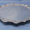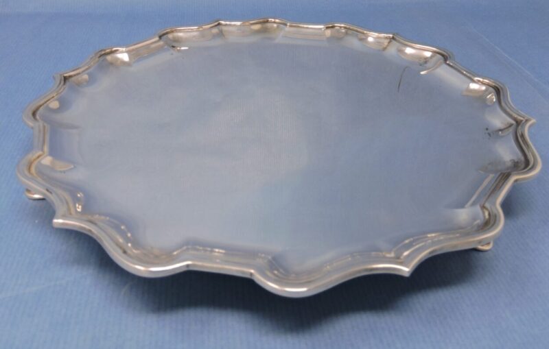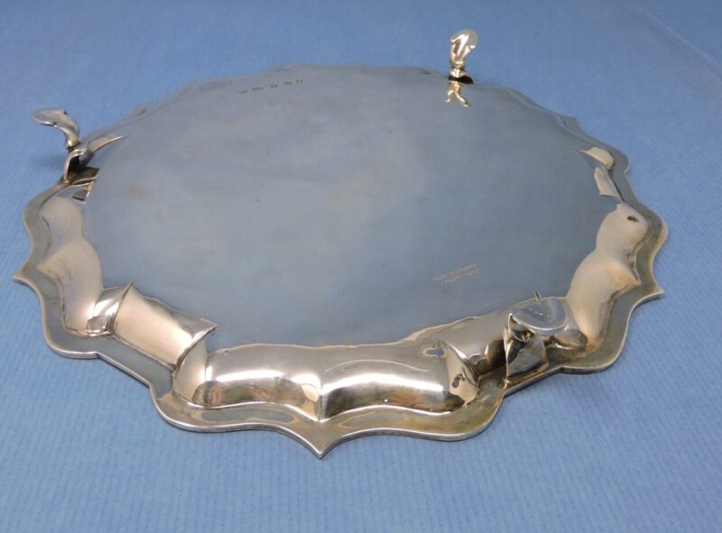 A wonderful 3-footed English hallmarked sterling silver salver with a scalloped rim. The hallmarks are for London, 1935, and show the maker as J.R. Ogden & Sons Ltd.