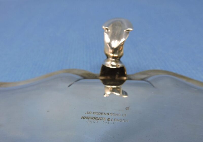 On the underside are the hallmarks on one side and, opposite, it reads “J.R. Ogden & Sons Ltd. Harrogate & London 1/3/58. SP / LI”.