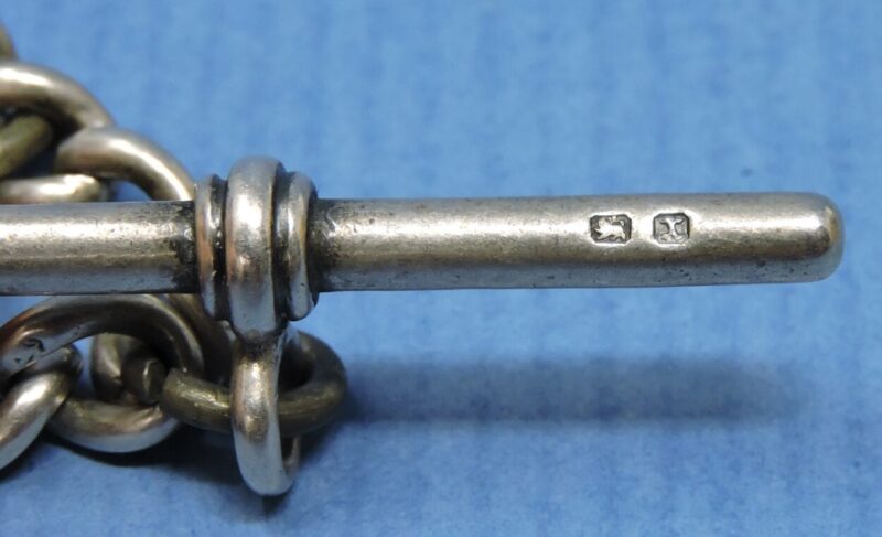 The watch chain has the maker’s initials “AMH” on the hook and silver hallmarks on the bar at the end.