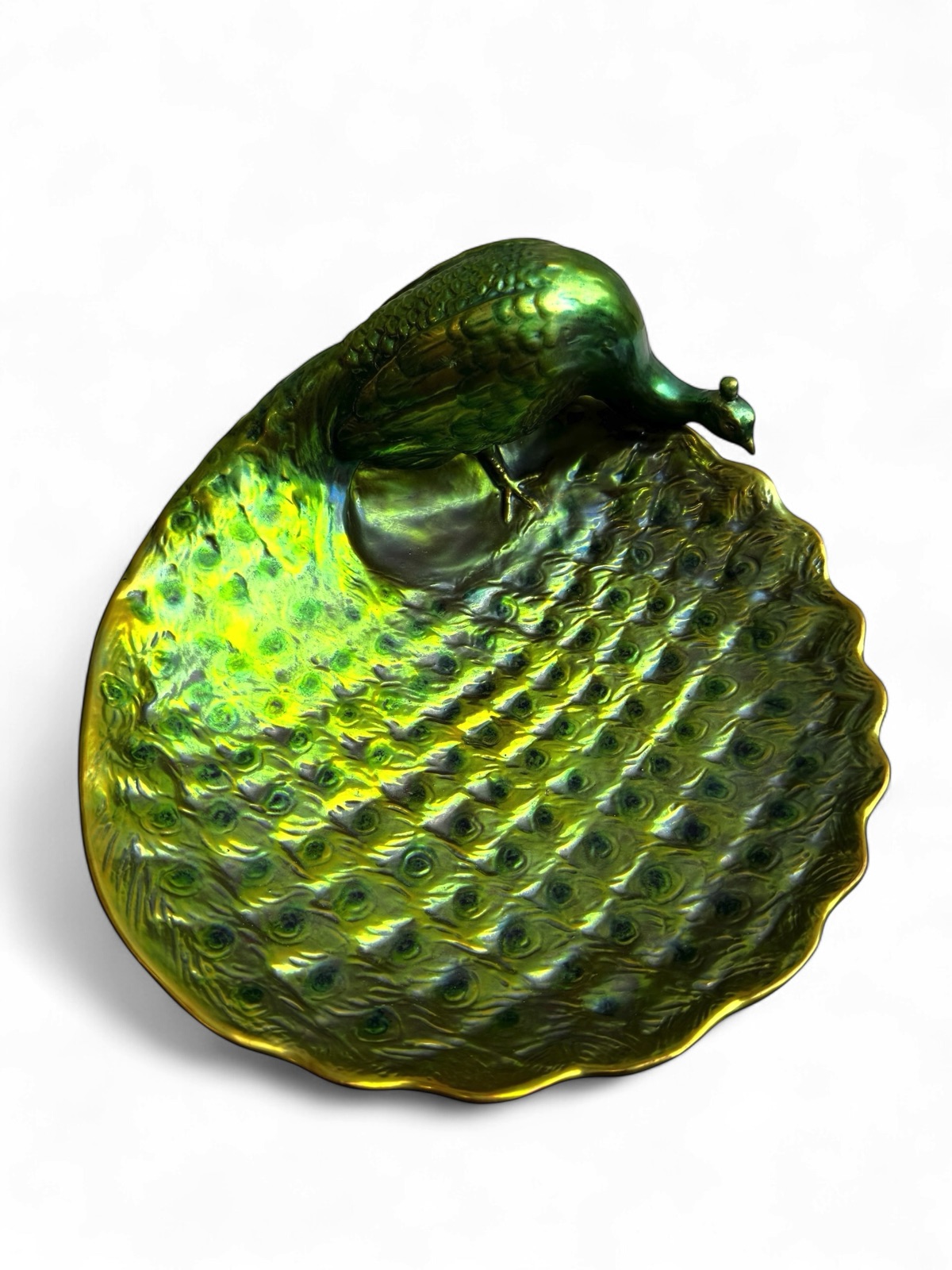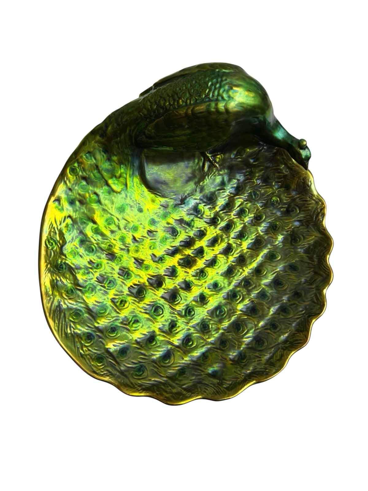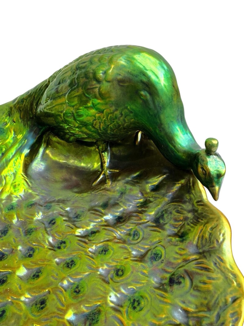 Striking Large Hungarian Zsolnay Peacock Bowl in Lustre Green