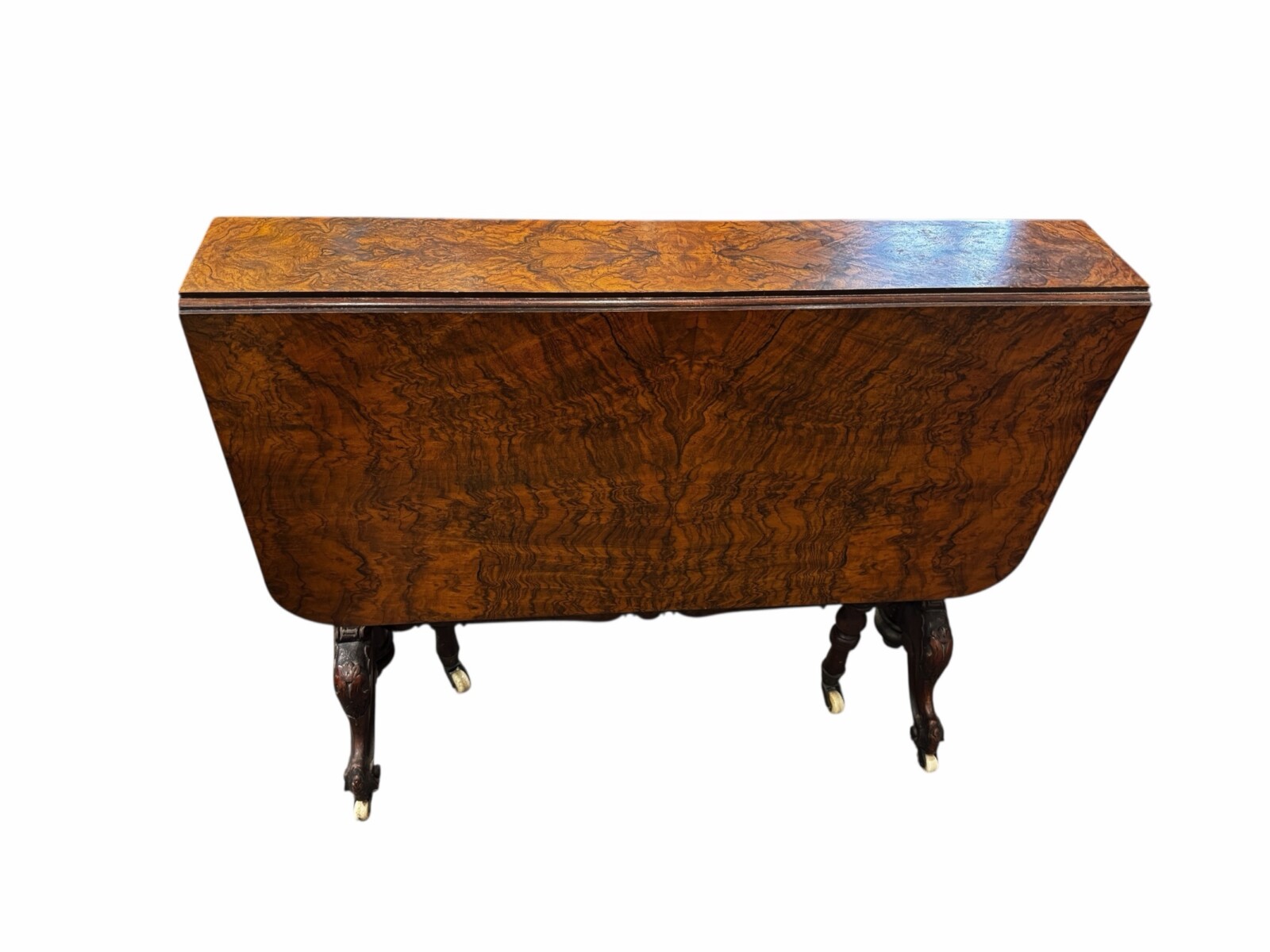 FurnitureOutstanding Victorian era, burled walnut drop leaf Sutherland table. Two drop leaves with a rectangular shaped edge, are supported by elegant central turned baluster-form columns with two swing out gate legs and standing on attractive scroll feet with original porcelain castors. Called a “Sutherland” table which is described as a compact, Victorian-era folding table with a narrow centre and two large, drop-down leaves that create a generous surface when extended, named after Harriet, Duchess of Sutherland; it’s known for its space-saving design, often used for tea service or games, featuring gate legs, turned supports, and typically made from walnut or mahogany with elegant casters.