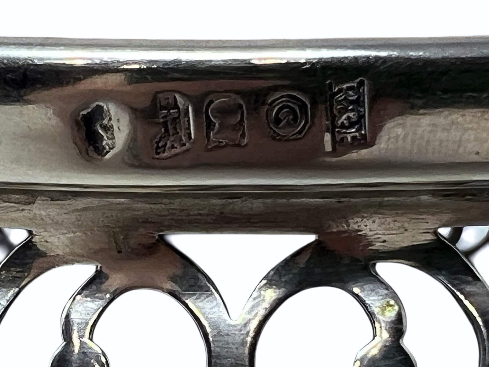The Dutch hallmarks are struck along the silver rim of one of the pair but are worn with age and use.  These marks indicate & signify the official .833 purity standard for fine Dutch silver. The presence of a Minerva head assay mark confirms the pieces were professionally tested and verified in a historic Dutch assay office. The maker’s mark, featuring an initial “R” points toward a specialized silversmithing firm such as Ruijter or Rietveld, both of whom were renowned for their mastery of pierced and repoussé silver during this period.