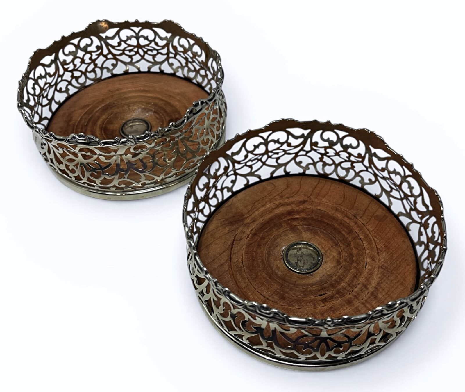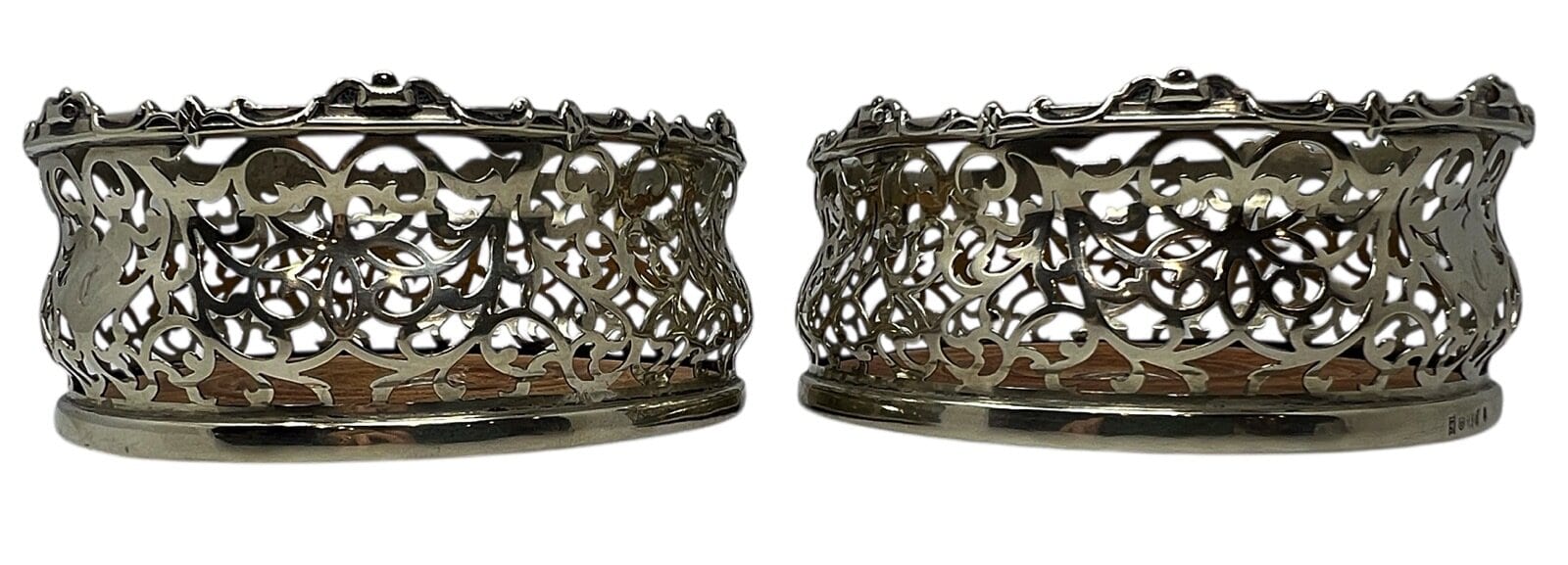 This magnificent pair of authentic Dutch silver wine coasters, measuring 5.75 inches in diameter, represents the exceptional quality of early 20th-century European silverwork. Each coaster features an intricately hand-pierced gallery wall showcasing a classic scrolling foliate design, a hallmark of the Dutch Rococo Revival style. The silver is securely mounted to a solid turned-wood base, offering a rich contrast to the brilliant metallic finish. These large-format pieces were specifically designed to accommodate standard wine bottles or formal crystal decanters, making them a functional centerpiece for any sophisticated tablescape.
