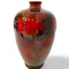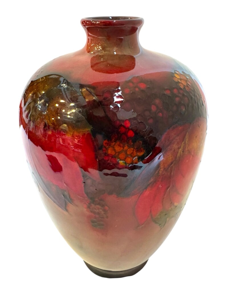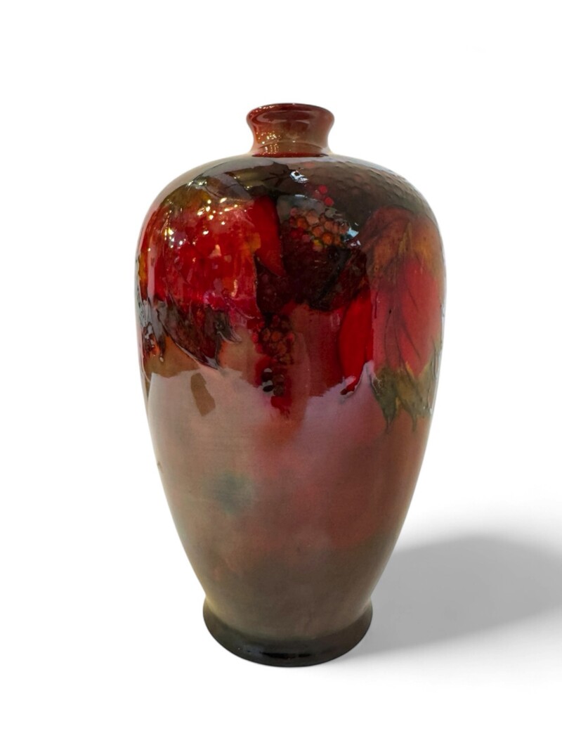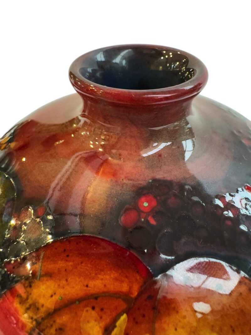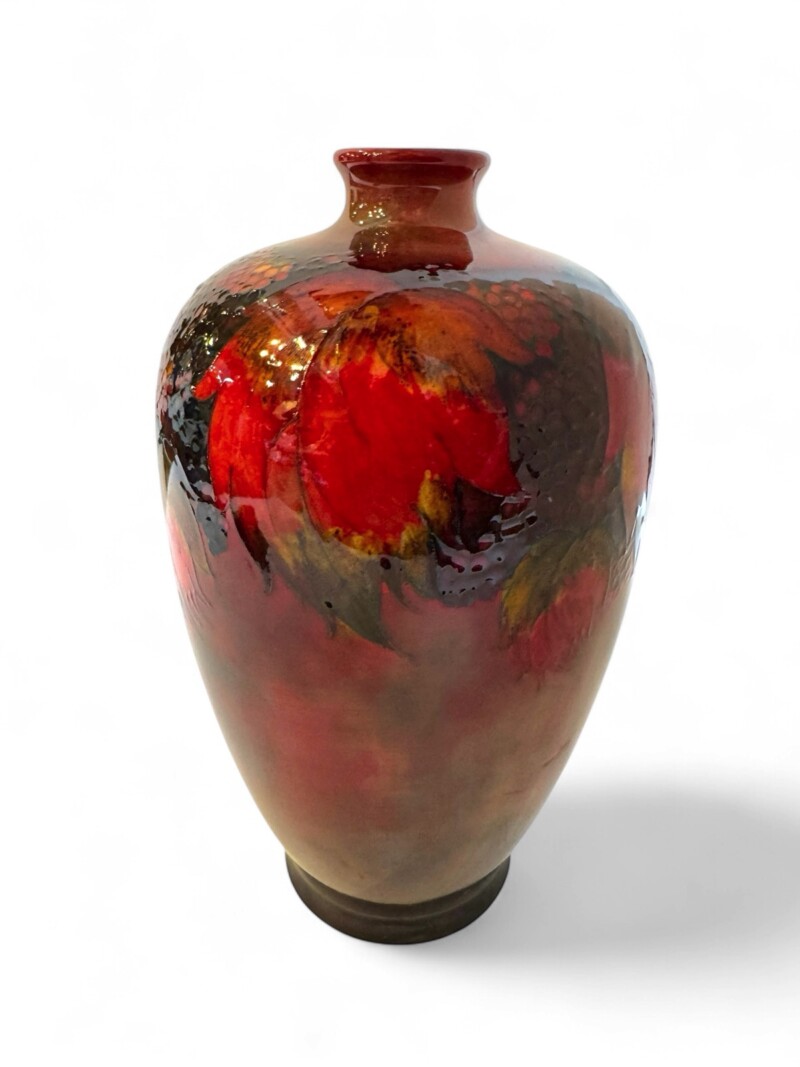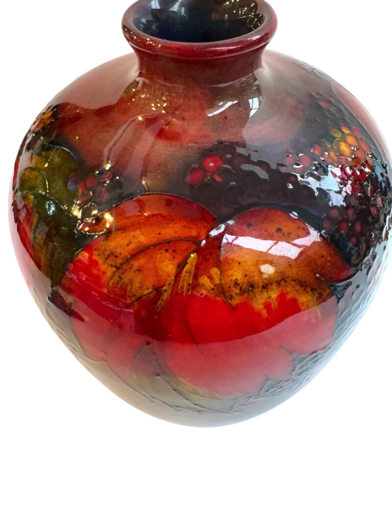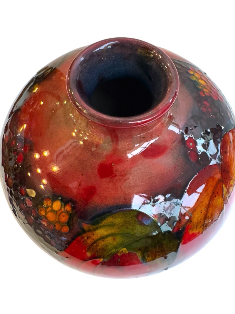 A stunning William Moorcroft flambé vase in the “Berry & Leaf” pattern, circa 1930. Rich & intense cadmium reds & deep purples with beautiful background glaze washes of muted mossy greens & azure blues.  In excellent condition with the full signature of William Moorcroft on the base in blue.