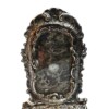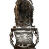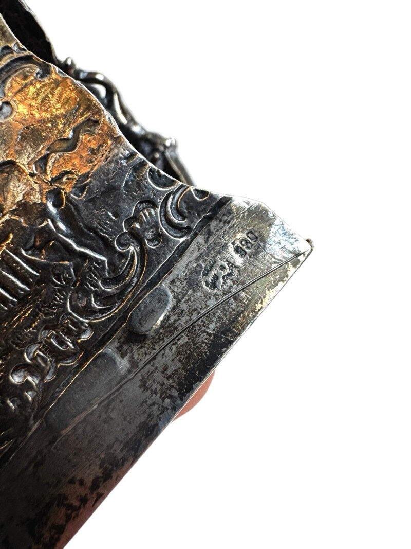 Hanau Silver was named for the German city where since the 16th century it was a centre of precious metal working, with many gold and silver smiths.  At that time there were no guild or hallmark laws in Hanau, but much of the antique reproduction silver was made there well into the 19th century. Craftsmanship and knowledge of period styles is distinctive in the intricate repose work where many Hanau objects feature hammering from the reverse side to create raised detailed designs on the front. These sculptural elements are often of mythological or allegorical figures, foliage, flowers, and animals.