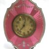 A magnificent pink guilloche work enamel clock over Swiss .935 silver.  The Swiss movement requires 8 days between windings.  The flat faced clock has a retractable stand (much like a picture frame) that will allow it to stand on a table when it is not lying down in it’s original fitted box.
