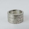 A stunning sterling ring with a scripted notes design from Tiffany & Co, New York. It is quite large with a bold shape, but is the right balance of simplicity and elegance. The scripted notes design contains a stylized font with the Tiffany & Co., and address, ‘ Fifth Avenue and 57th Street, New York’.