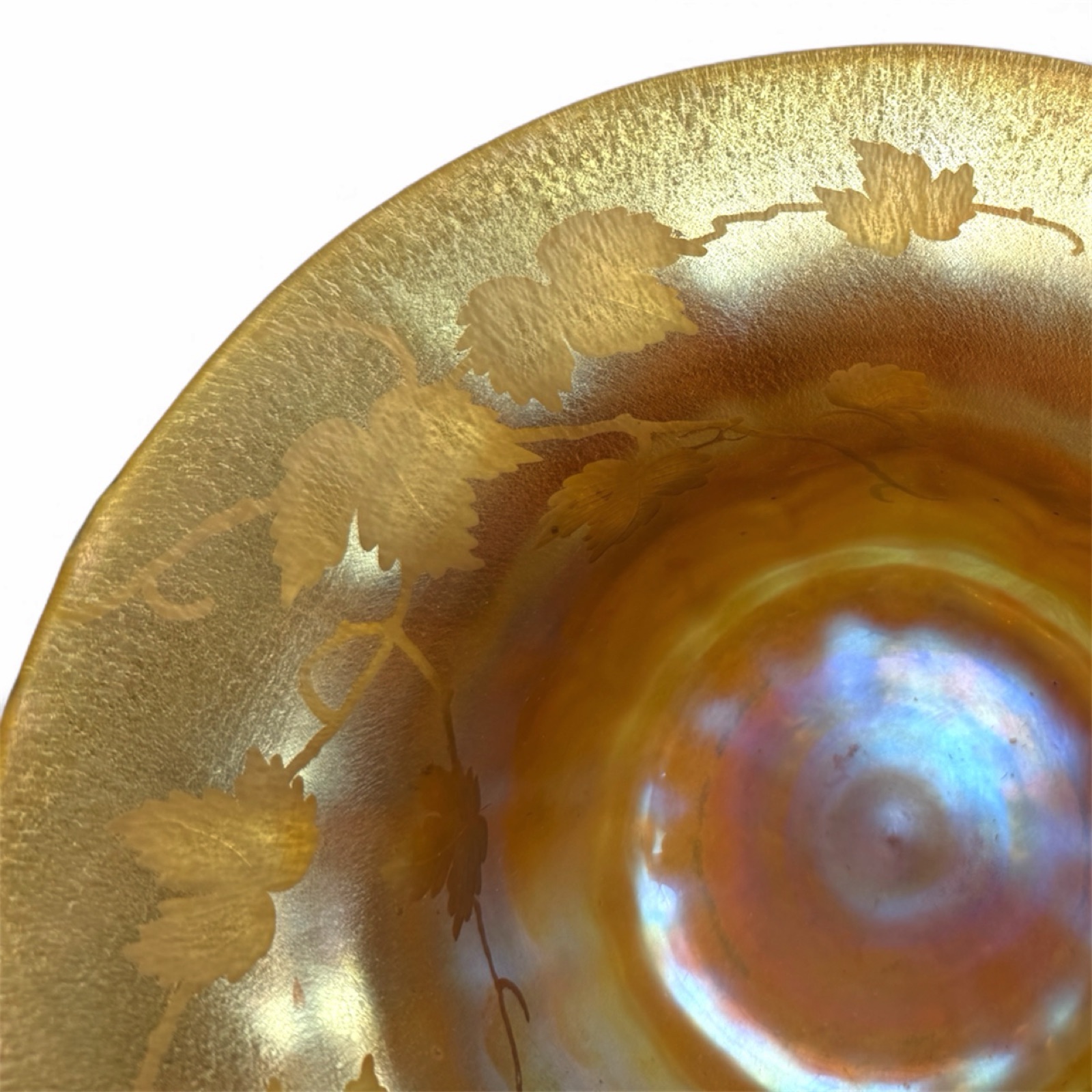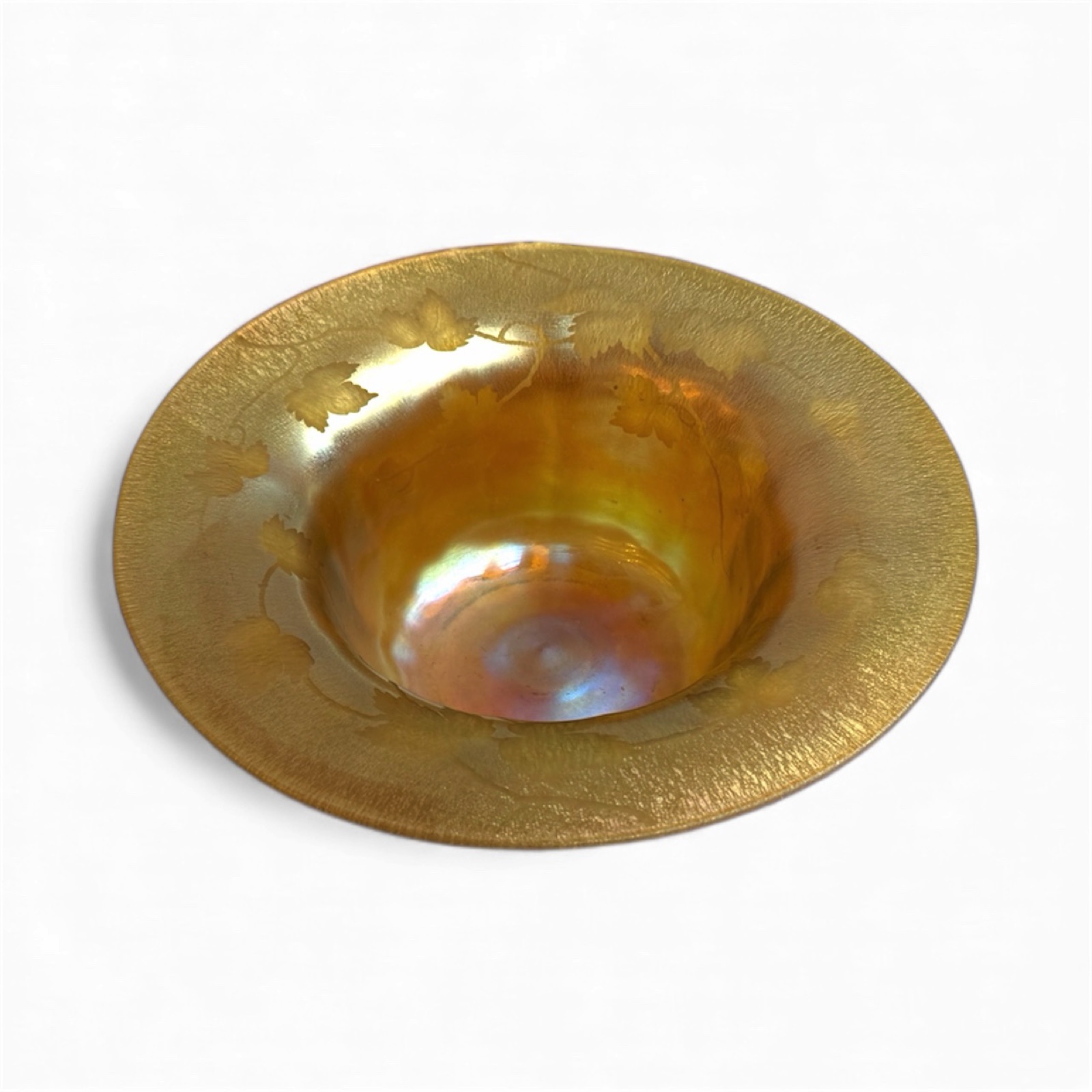 Art Glass / CrystalA beautiful early Tiffany Studios Favrile glass bowl, displaying the classic rich amber–gold iridescence that made Louis Comfort Tiffany’s work world-renowned. The wide flaring rim is delicately acid-etched with a continuous vine and leaf motif, creating a soft matte contrast against the luminous interior.