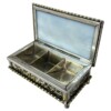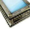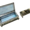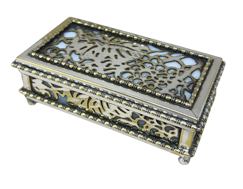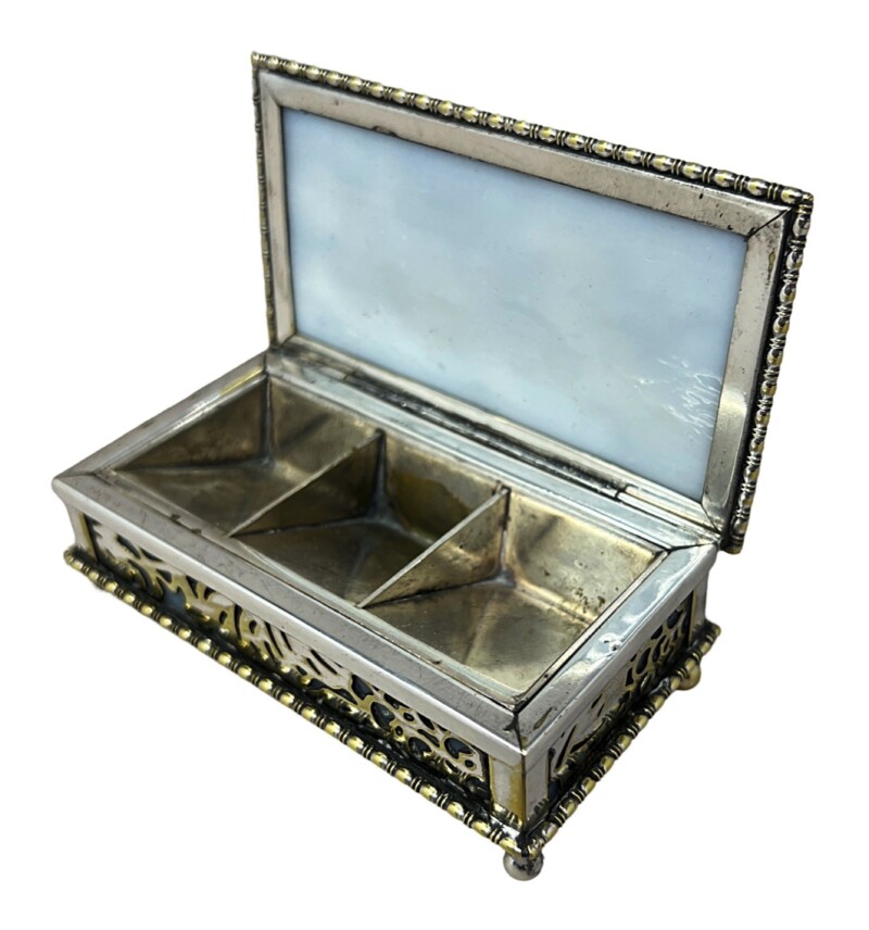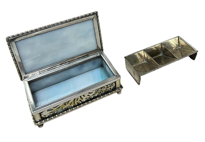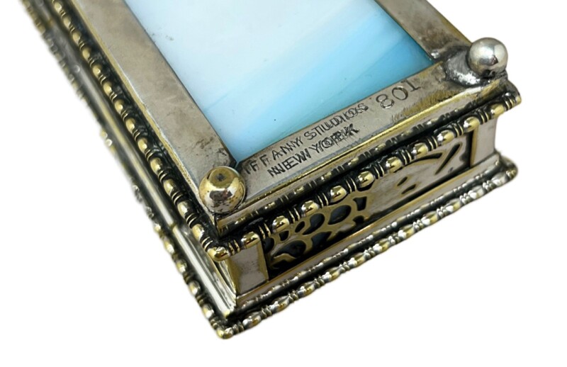 v** SOLD ARCHIVES **vThis Art Nouveau rectangular stamp/desk box has a hinged round top and is raised on ball feet with the sides displaying a pierced grapevine pattern and detailed trim. Early 20th century, with pierced silver-plated decoration, over opaque glass, opening to reveal three stamp compartments. Marked ‘Tiffany Studios New York no. 801’ on the underside. Grapevine was one of the earliest desk set patterns for Tiffany and comprised over 25 different pieces. With the pierced metalwork it was designed to be reminiscent of Tiffany’s stained glass windows.