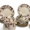 China Patterns“Ancestral” has become Minton’s classic signature pattern in fine bone china. Pattern features a classic design with a scalloped, swirl edge, hand-painted raised blue and red (or rust) enamel flowers with brown leaves, on a fine white bone china base, and finished with gold trim. It is widely considered one of Minton’s most classic and enduring designs. The “Ancestral” pattern was produced for over 40 years. Pieces can be dated by their backstamps. As seen on this set the “Wreath” backstamp dates from after 1951 up until 1991.