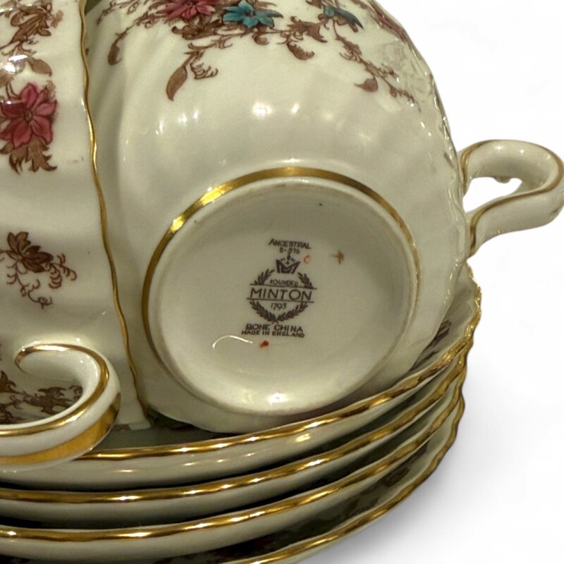 Minton china was acquired by Royal Doulton in 1968, but the “Ancestral” pattern continued to be produced under the Minton name until its discontinuation. “Ancestral” became one of Minton’s signature and most popular patterns, cherished by collectors for its regal and romantic, English country aesthetic.
