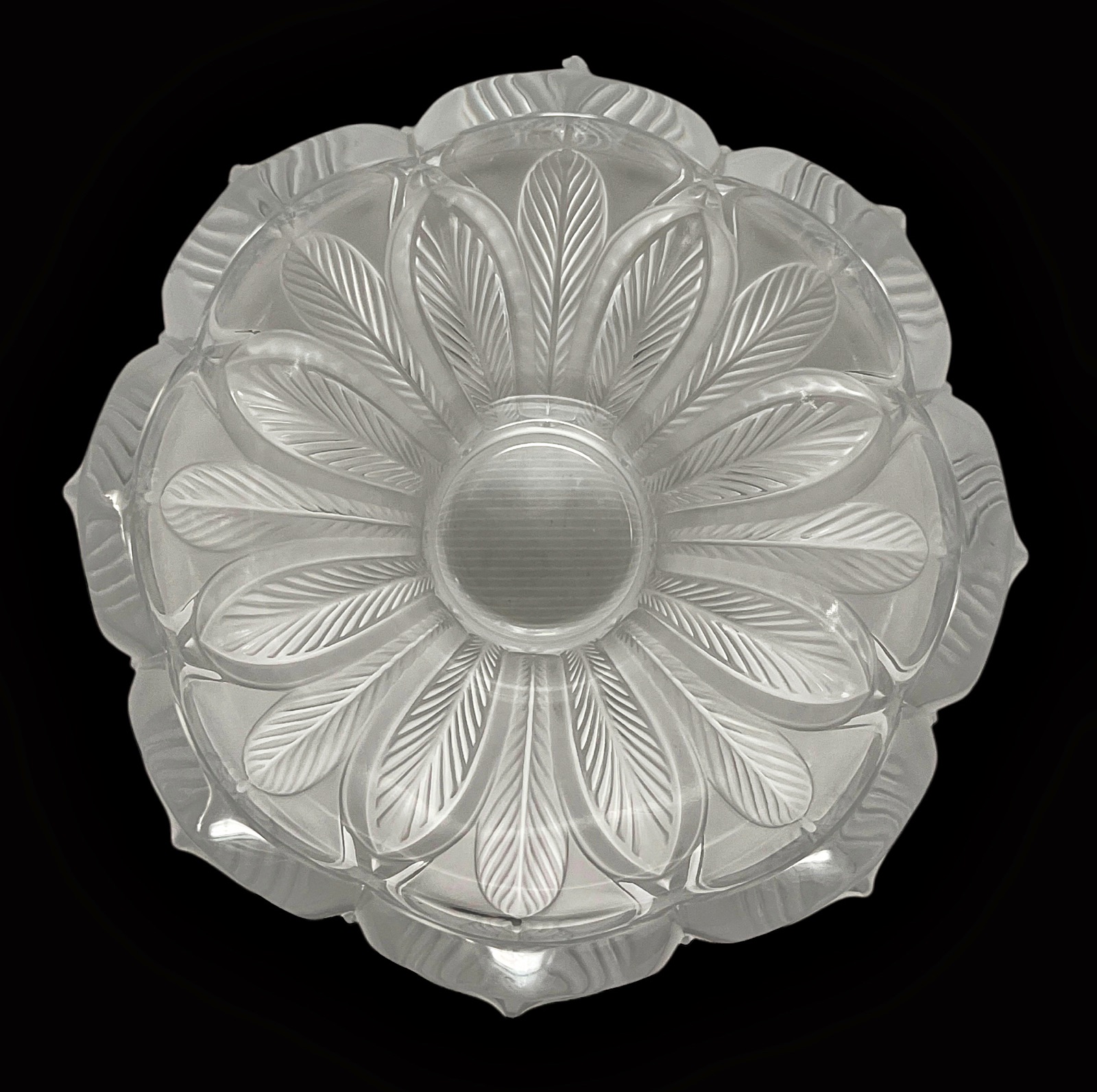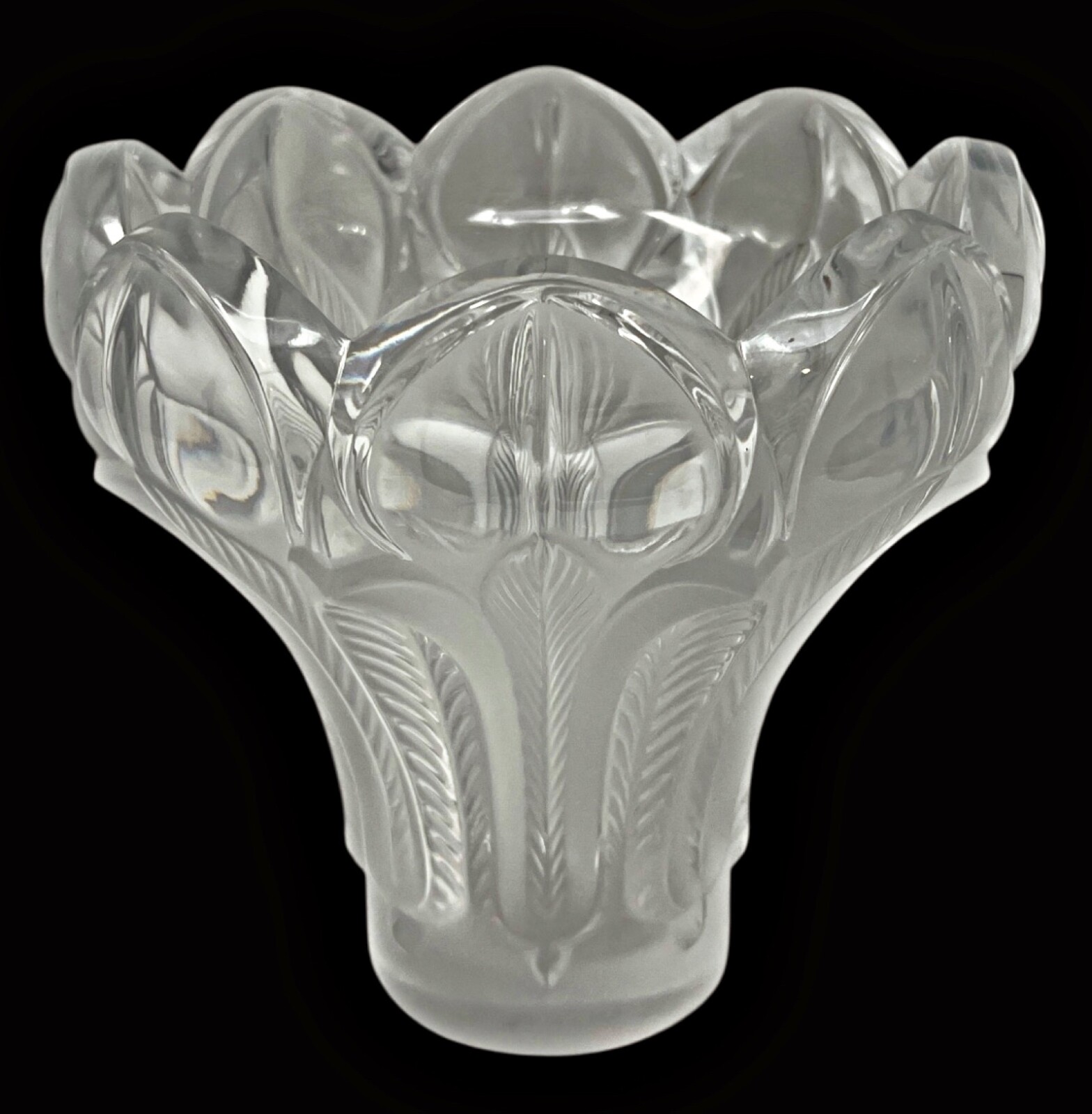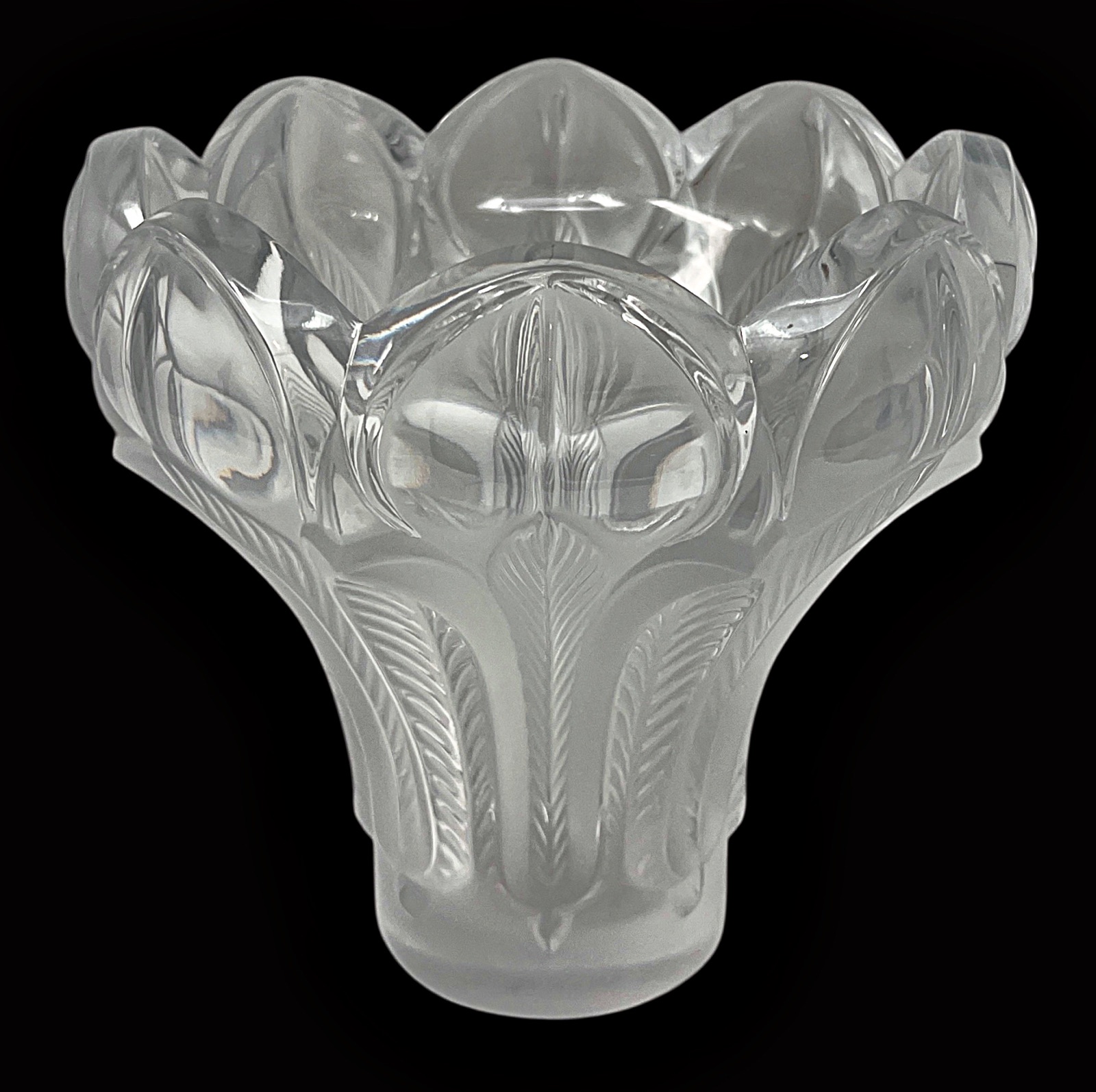 The vase is signed “Lalique / France” on the base. Named the “Esna” vase, reportedly created by Marie‑Claude Lalique (granddaughter of René Lalique) around 1984–85, and inspired by a motif from the site of Esna (Egypt) — hence the name. The vase commemorates the 125th anniversary of Rène Lalique’s birth. It has transparent parts alternated with stylized, satiny feathers that give the vase the shape of an open flower. In excellent condition.