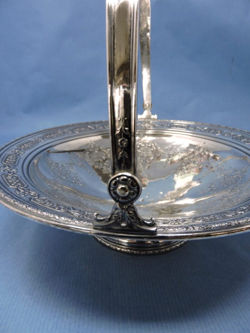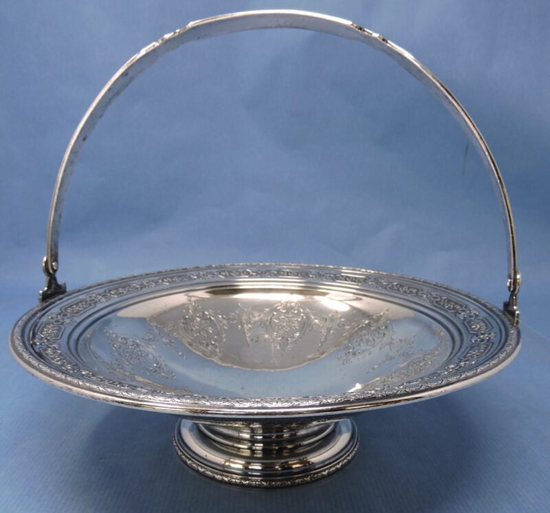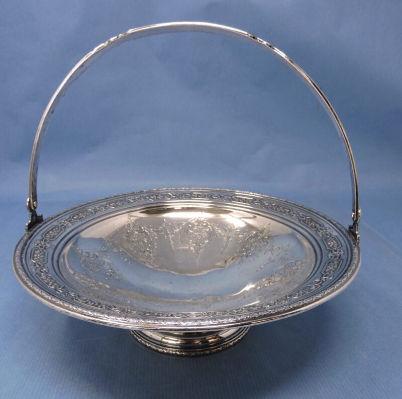 A gorgeous Towle USA engraved sterling silver basket with floral decoration and a hinged handle.