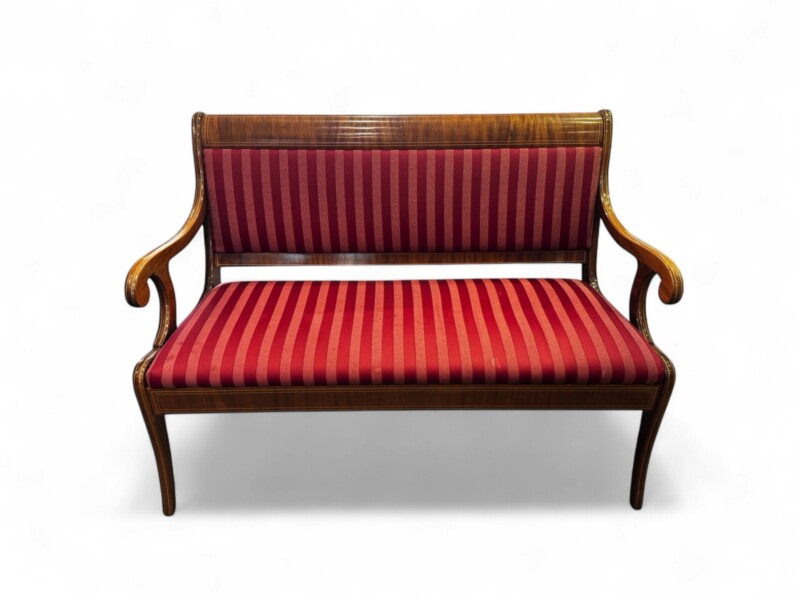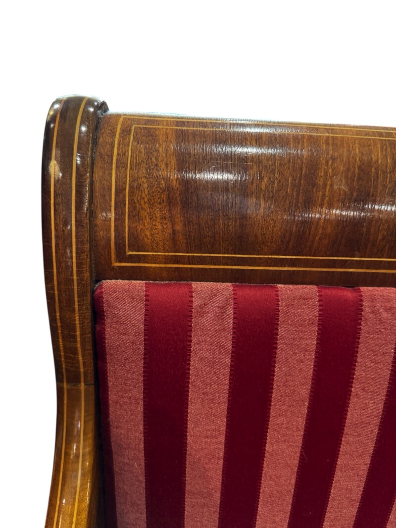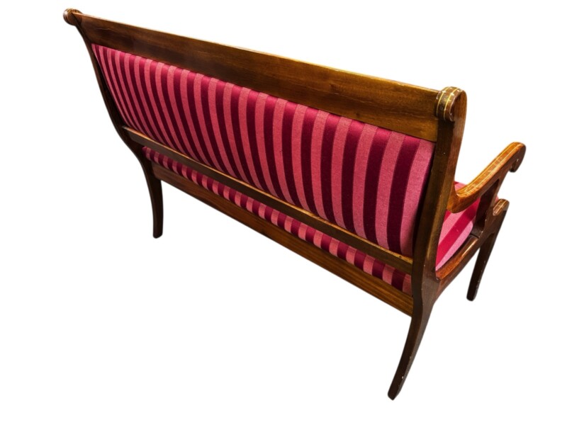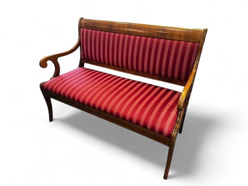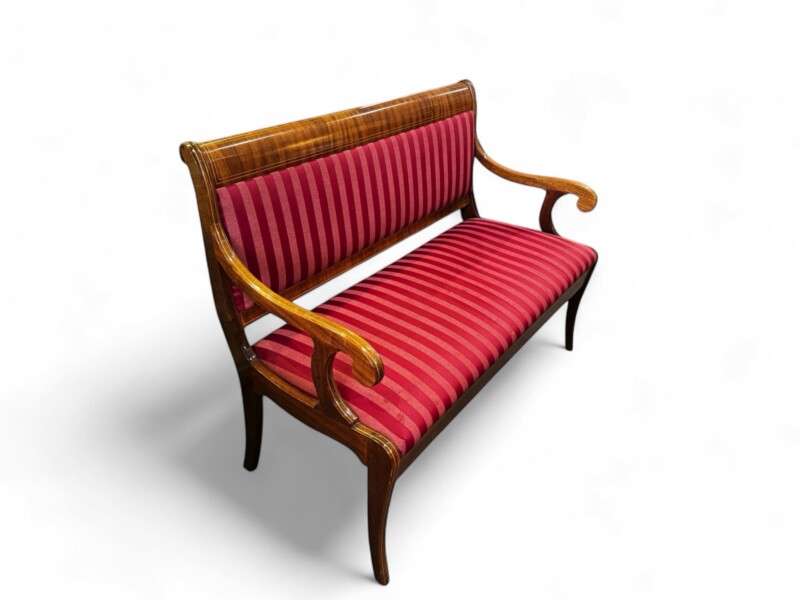 The mahogany veneer on this Biedermeier style bench is in excellent condition with inlaid satinwood trim. The side view shows extravagant side frames with slightly flared legs and the backrest is also attractively finished on both sides so that the piece of furniture can be placed anywhere in the room. The same type of full-surface veneering can also be seen on the armrests, which end in volutes.  Built for two people and functions as a separate  piece for any room, but because it has a dining table height seat, and firm upholstery, it is well suited as an accessory dining table bench, ideal for a dinner party.