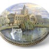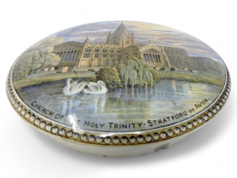 A lovely unframed Pratt Ware pottery medium-sized pot lid, titled “Church of the Holy Trinity – Stratford on Avon”.  The pot lid shows the church and churchyard / graveyard with a pair of swans in the water in front of the church.