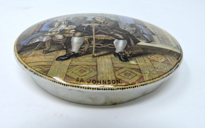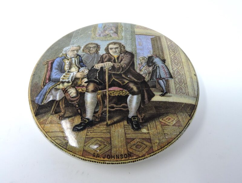 A very popular Pratt Ware pottery pot lid, titled “Dr. Johnson”. This is an adaptation of E.M. Ward’s picture in the Tate Gallery showing Dr. Johnson waiting to see Lord Chesterfield.