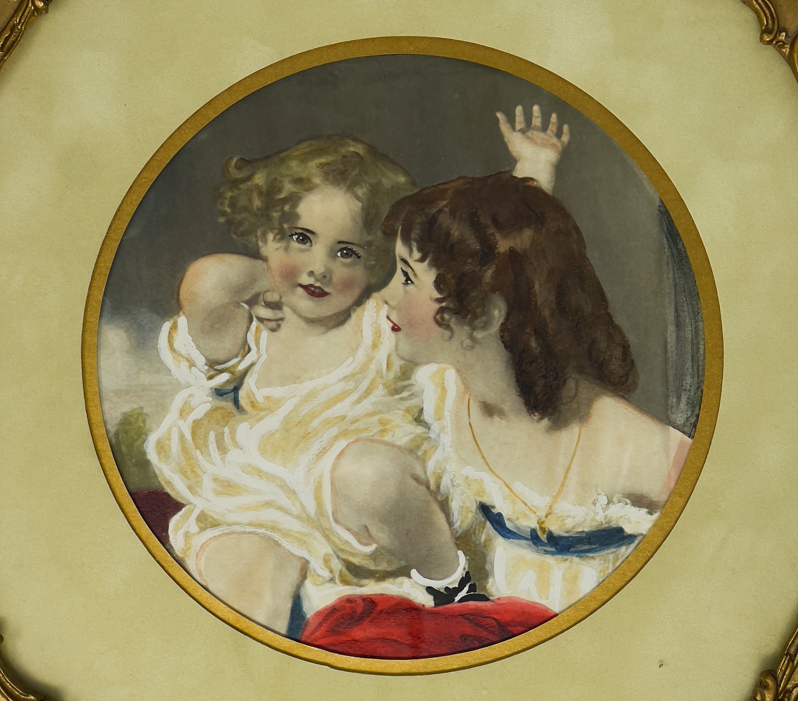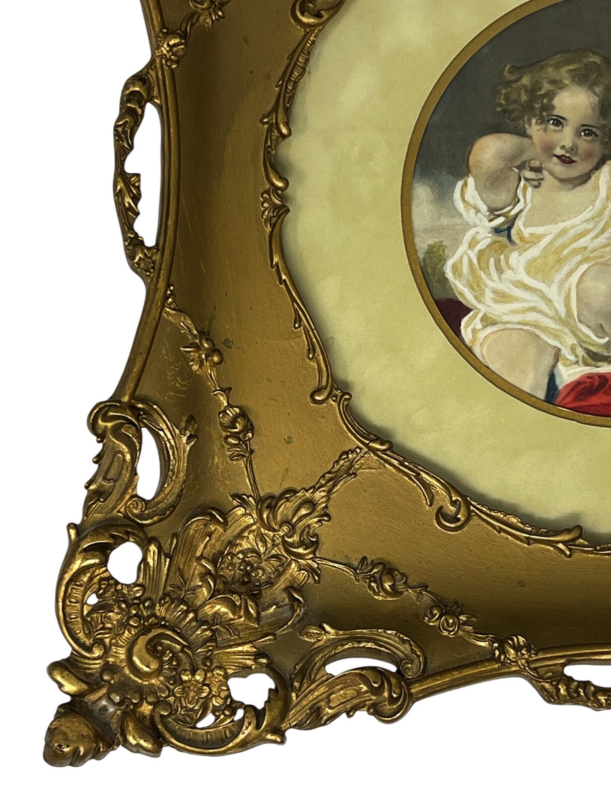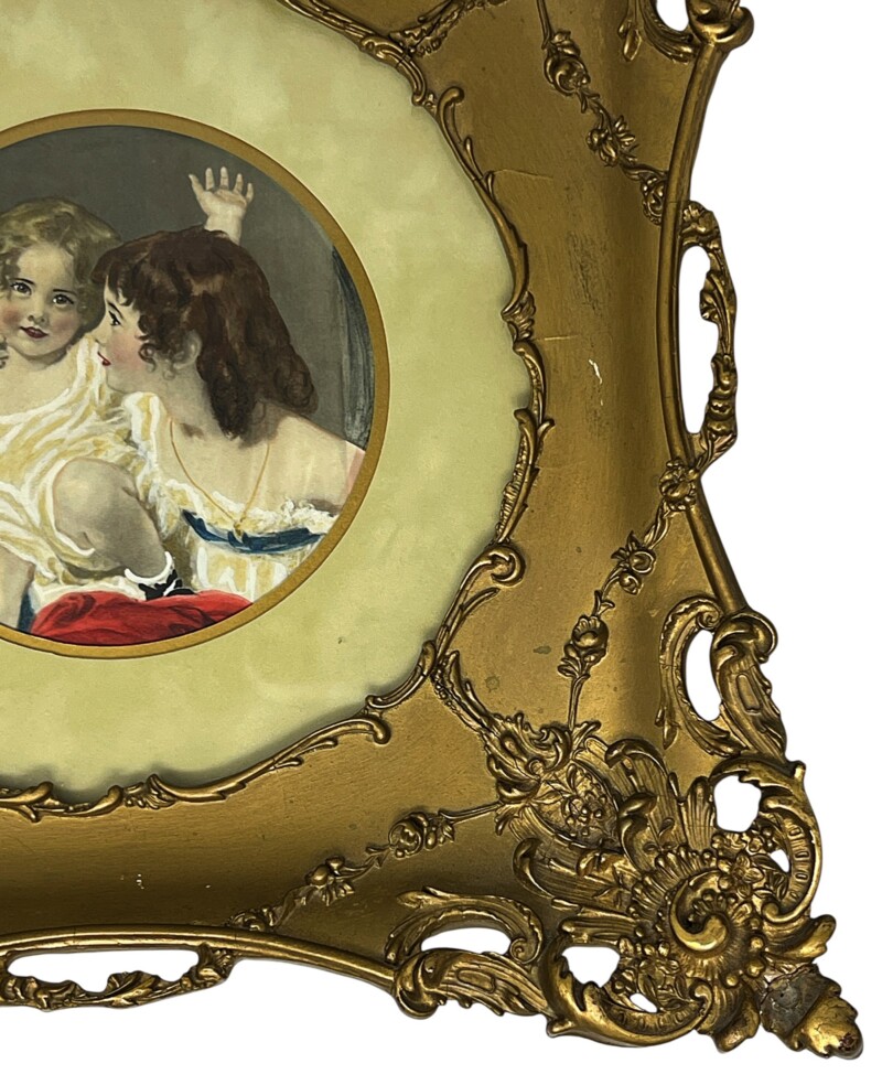 The original painting was in a circular format which only adds to the uniqueness of the image. The gilded ornate frame is in very good condition and reflects the era and aesthetics of the warm bond between the children.