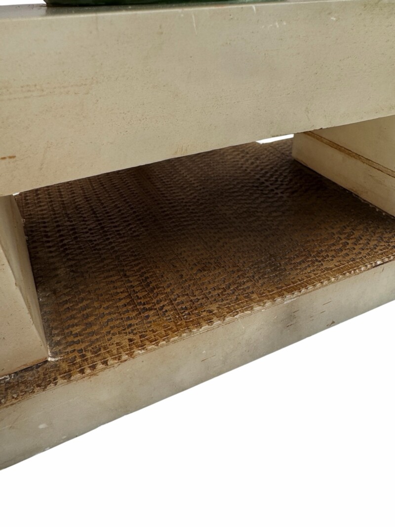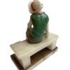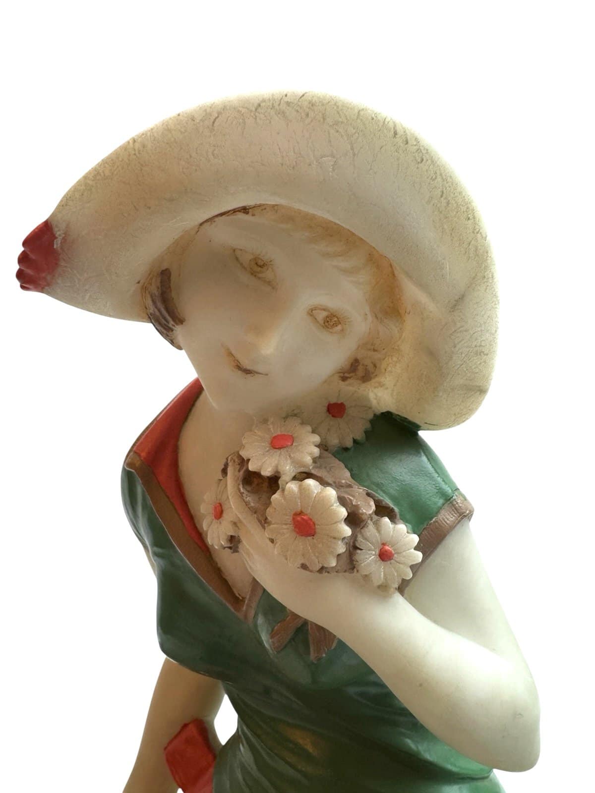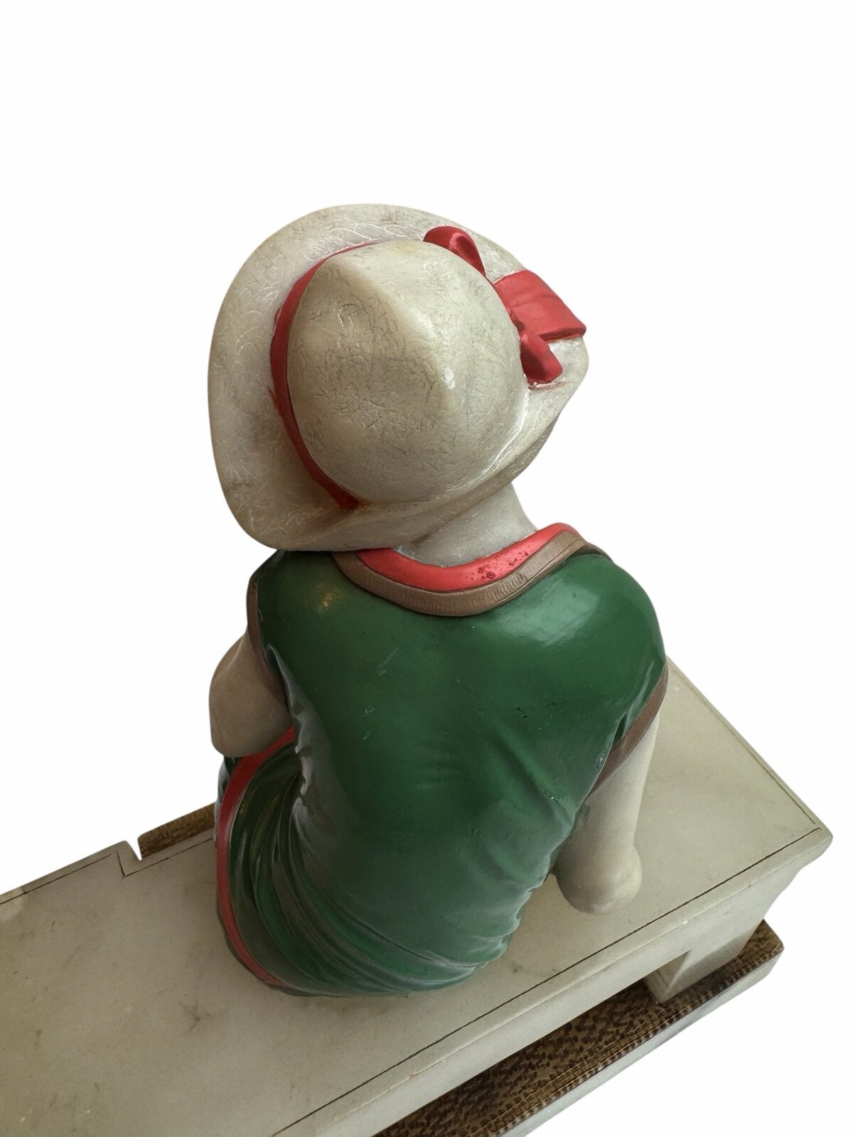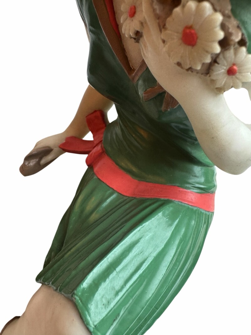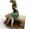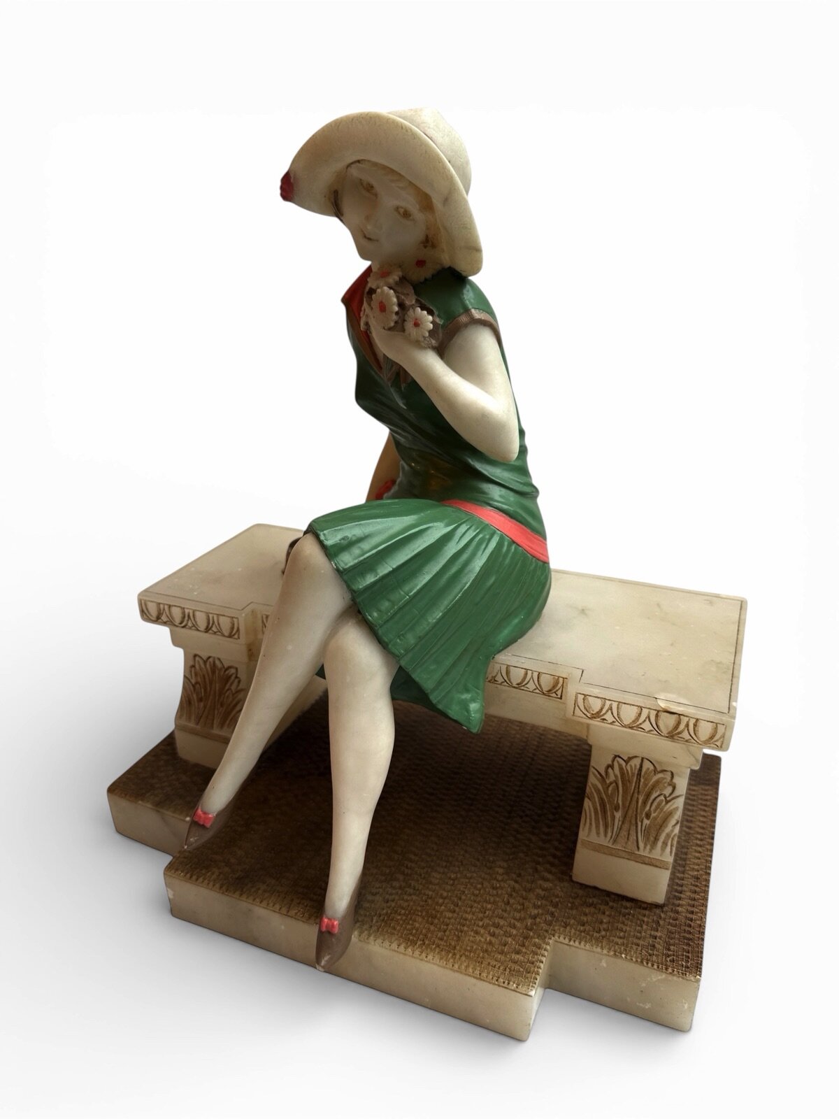 The figure is finished in original cold-painted polychrome, with a vibrant green dress accented by coral trim and contrasting pale head and arms in the “chryselephantine manner”, a style inspired by ancient ivory and gold sculptures and revived during the Art Deco period to create dramatic contrast between materials. The modeling of the dress folds and the naturalistic posture of the seated figure demonstrate the influence of French decorative sculpture workshops that flourished in Paris during the late 1920s and early 1930s.