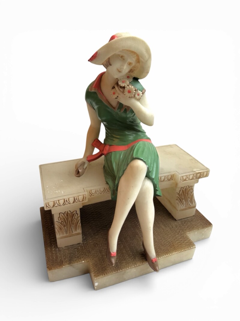 Art, GeneralA graceful Art Deco figural sculpture depicting a fashionable young woman seated upon a stylized bench and gently holding a small bouquet of flowers. The figure is modeled in the elegant spirit of the late 1920s, wearing a pleated dress and cloche hat typical of the fashionable “flapper” era, reflecting the changing social freedoms and modern style of women during the interwar period. Her relaxed pose, delicately turned head, and softly draped garments convey the refined sophistication that defined decorative sculpture of the Art Deco movement.