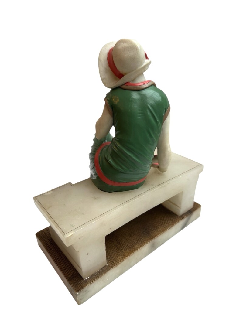 Vibrant French Art Deco “Seated Flapper Lady on a Bench Sculpture”, Signed R. Scheggi, Cold Painted Figure on Architectural Alabaster Base, Circa 1925–1935