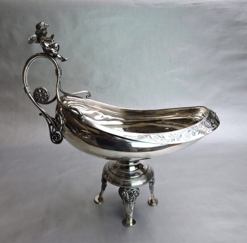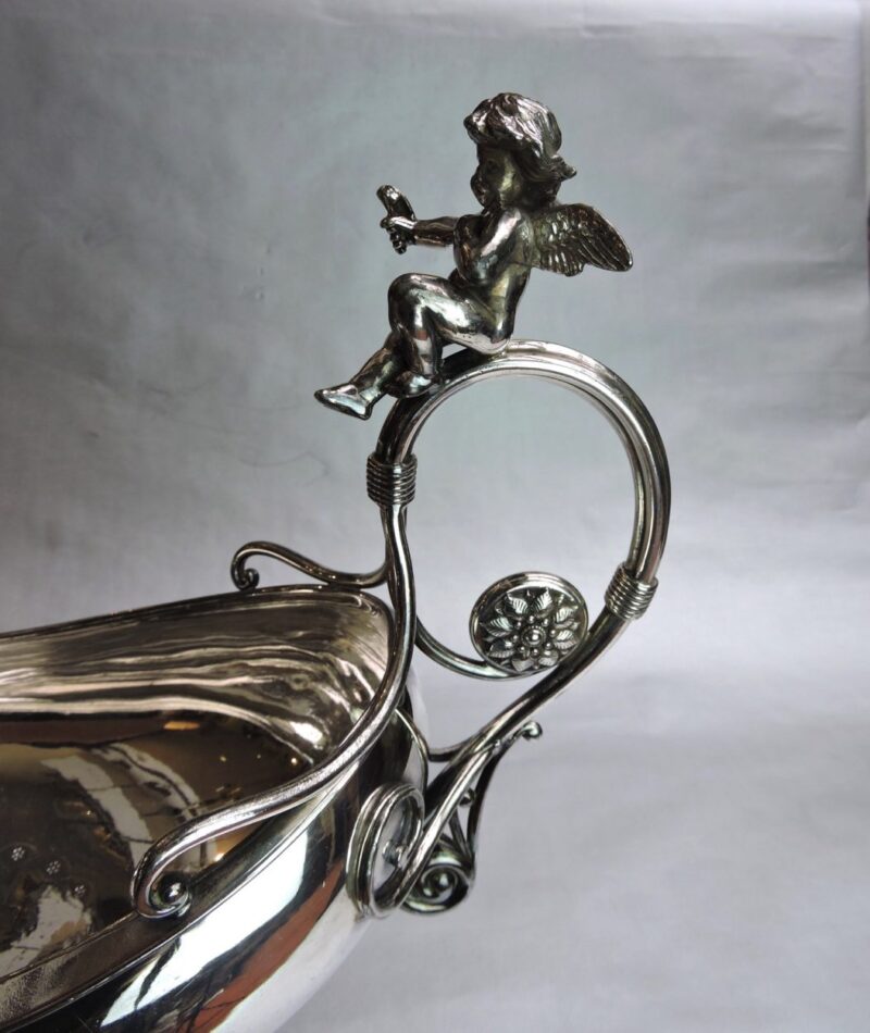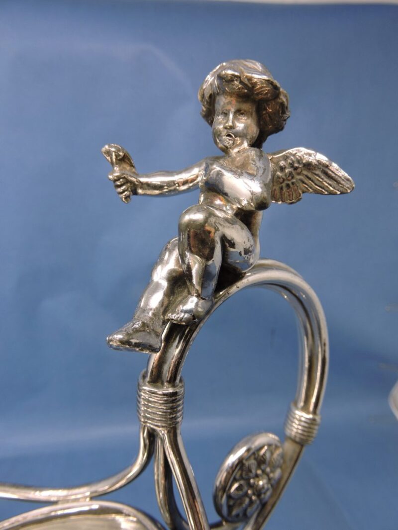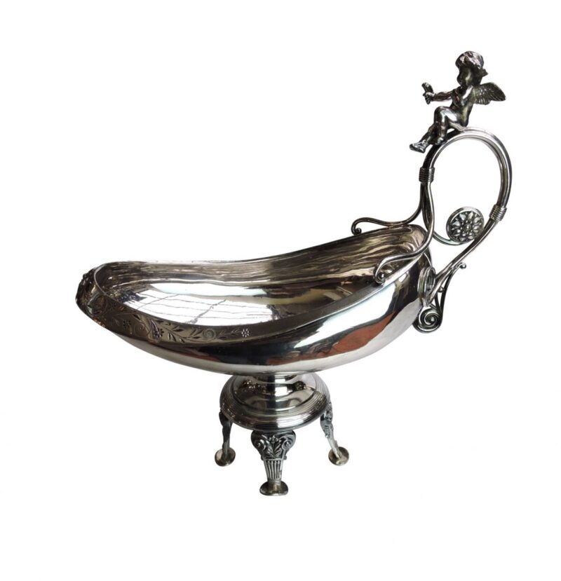 A wonderful Victorian American silver-plate footed centrepiece with a cherub decoration and etched designs on the body of the piece.