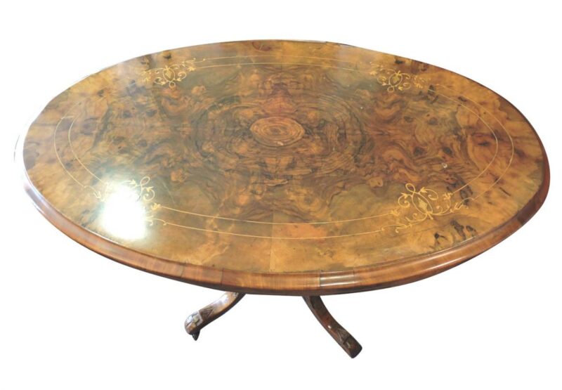 A beautiful burled walnut Victorian oval table with carved walnut base.