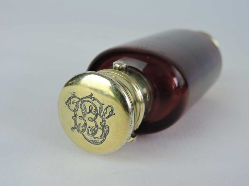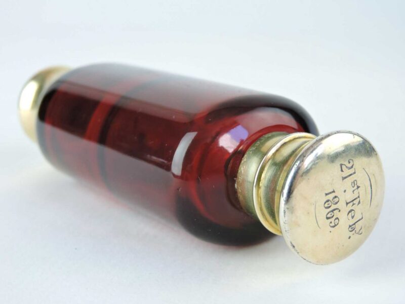 A beautiful cranberry glass double end perfume bottle, it dates Victorian period. It consists of a lovely long oval shape with faceted sides, and two large silver ends with decorative inscriptions. It is inscribed with cursive letters on one end, and, “21st Feb 1869” on the other. One lid end screws, while the other is a hinged lid with a stopper, both lids are in solid working condition.