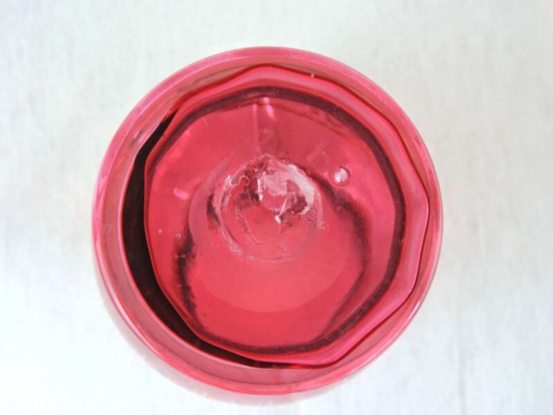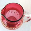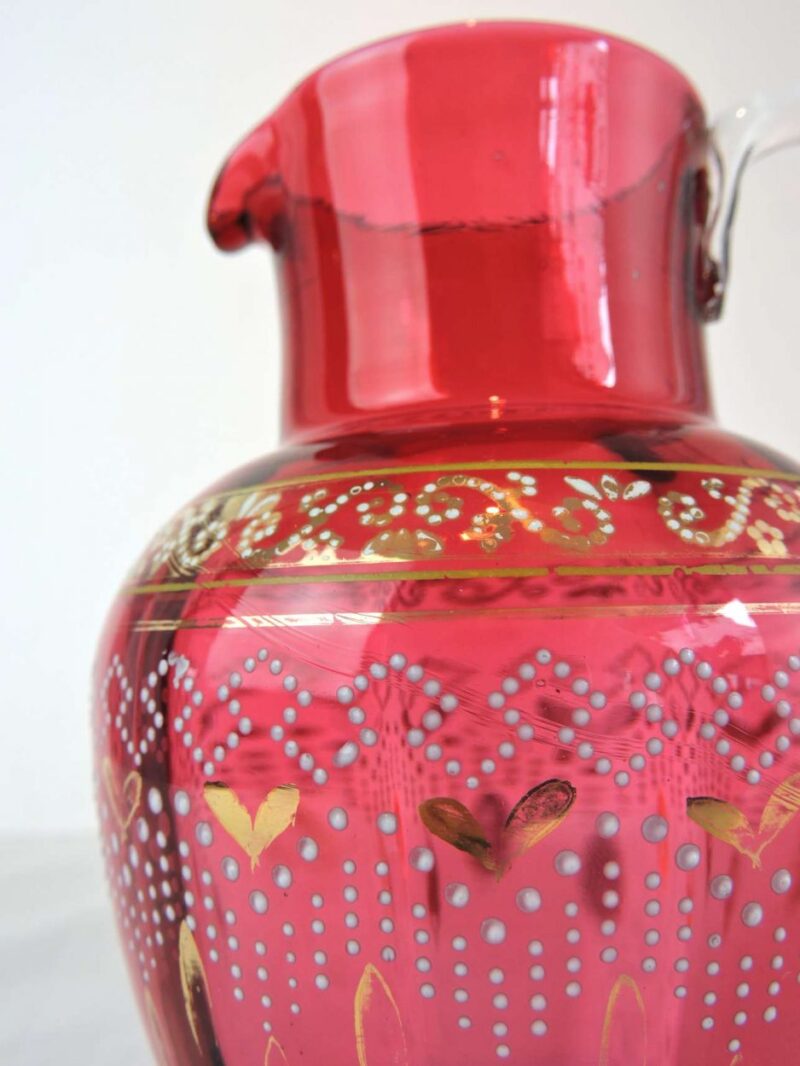 A beautifully glass blown cranberry jug, with a hand-painted gilt & enamel decoration, it dates back to the Victorian era. It features,  a lovely heart shape with a well-polished pontil to set in place, a narrow neck  and peak, and a clear handle ready to pick up and pour.