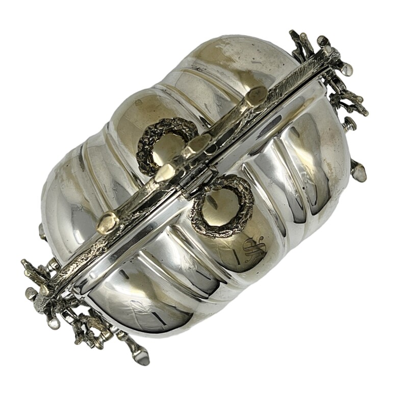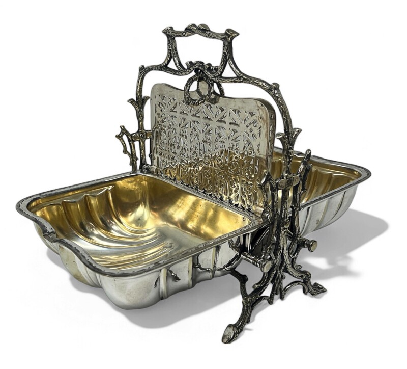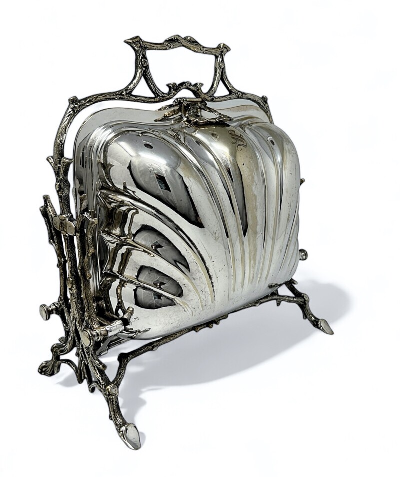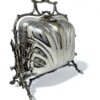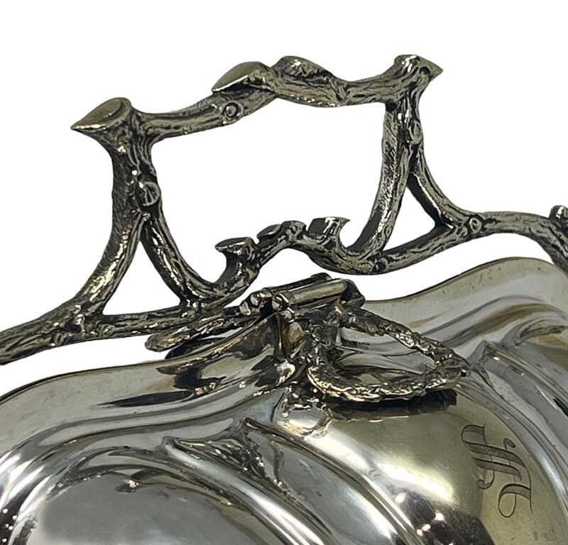 v** SOLD ARCHIVES **vA magnificent and decorative folding biscuit box, with wonderful organic references to the natural elements of the “shell shape” as a protective container and the “forest frame” in the form of tree branches with “hoofed feet”, adds to this treasure of design.