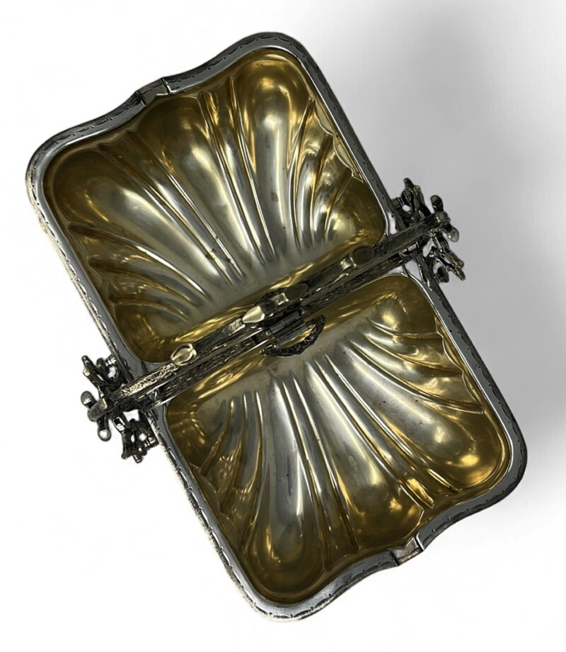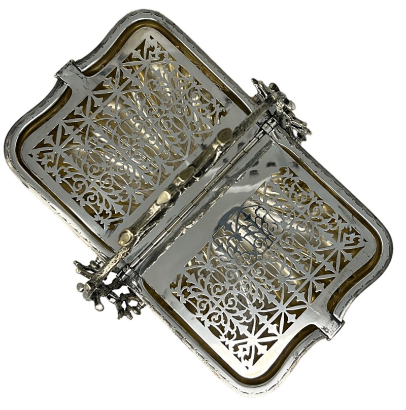 The box when opened reveals a splendid two compartment box each with a pierced grill with the interior of the shells beautifully gilded. The patterned pierced grills keep the biscuits in place which can be lifted to access the contents.