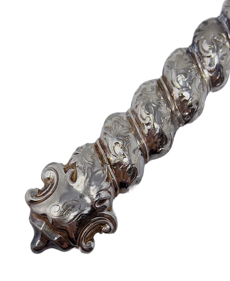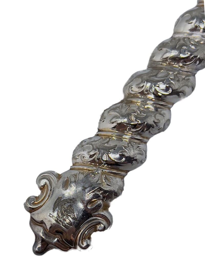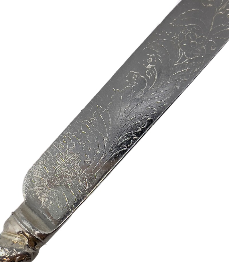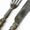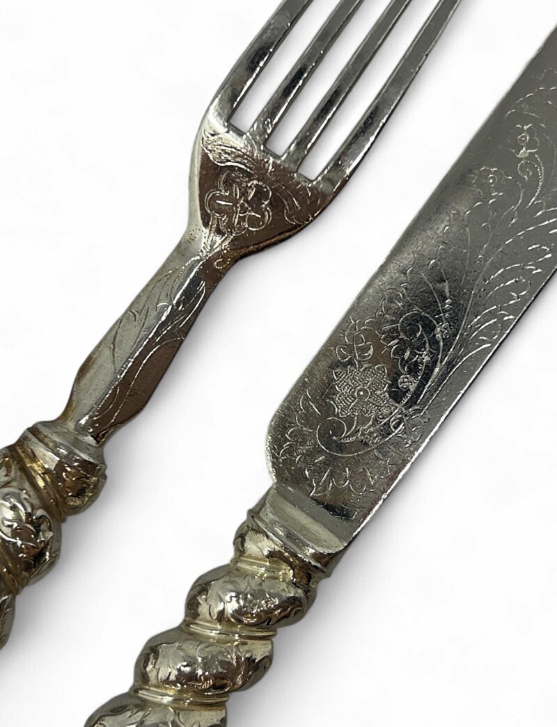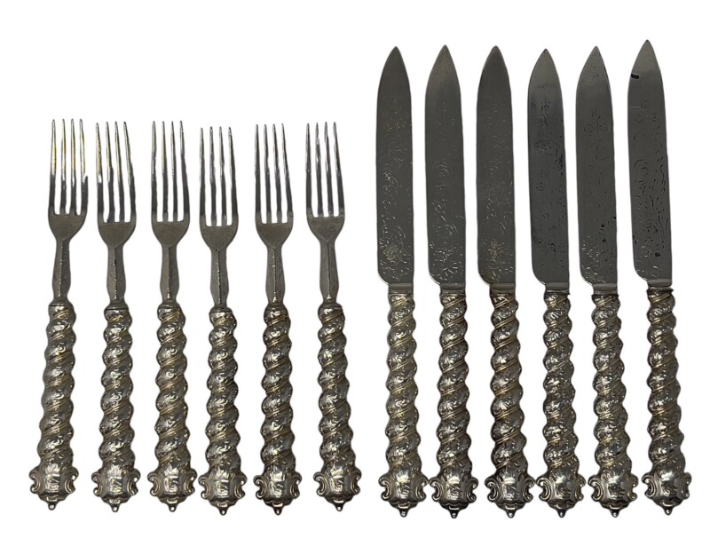 Victorian late 19th century fruit set: 6 knives and 6 forks. Gorgeous rope-turned handles with lovely detailed floral/leaf pattern engraving on both sides of the knives and forks. Very bold design balanced with very detailed engraving makes for an interesting dessert!
