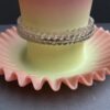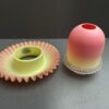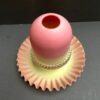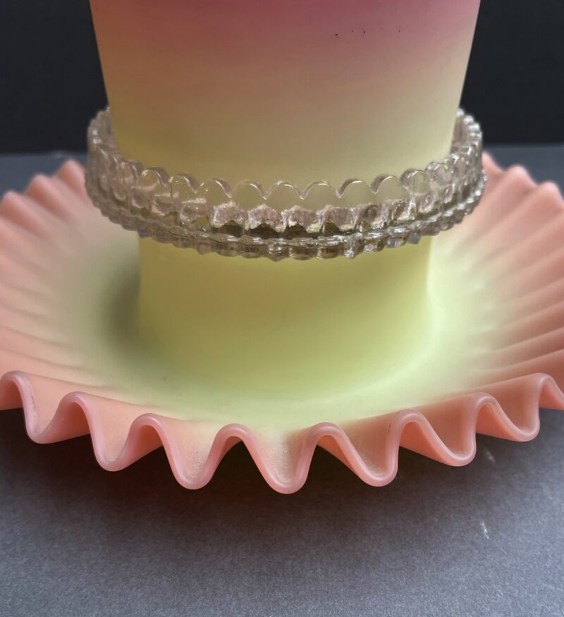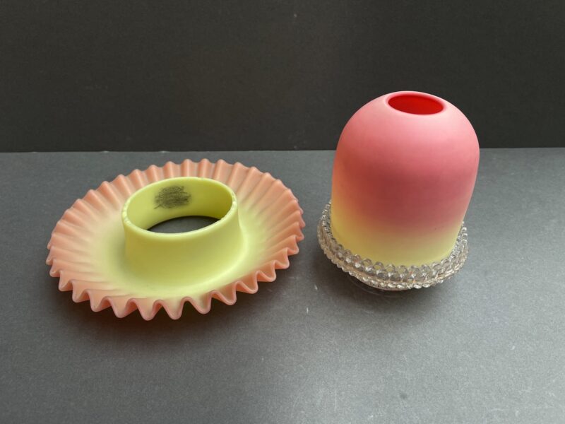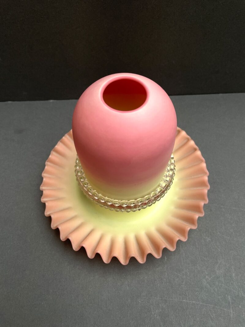 The lamp consists of three original and intact pieces: a domed shade, that graduates in colour from a rich, warm rose at the top, to a pale butter yellow at the bottom; a pressed glass, clear “crystal” liner, inside the base; and a saucer stand, with an open cylindrical centre, deepening in colour from pale yellow in the middle to the same rose as the top of the shade, along the raised, frilled, outer rim.