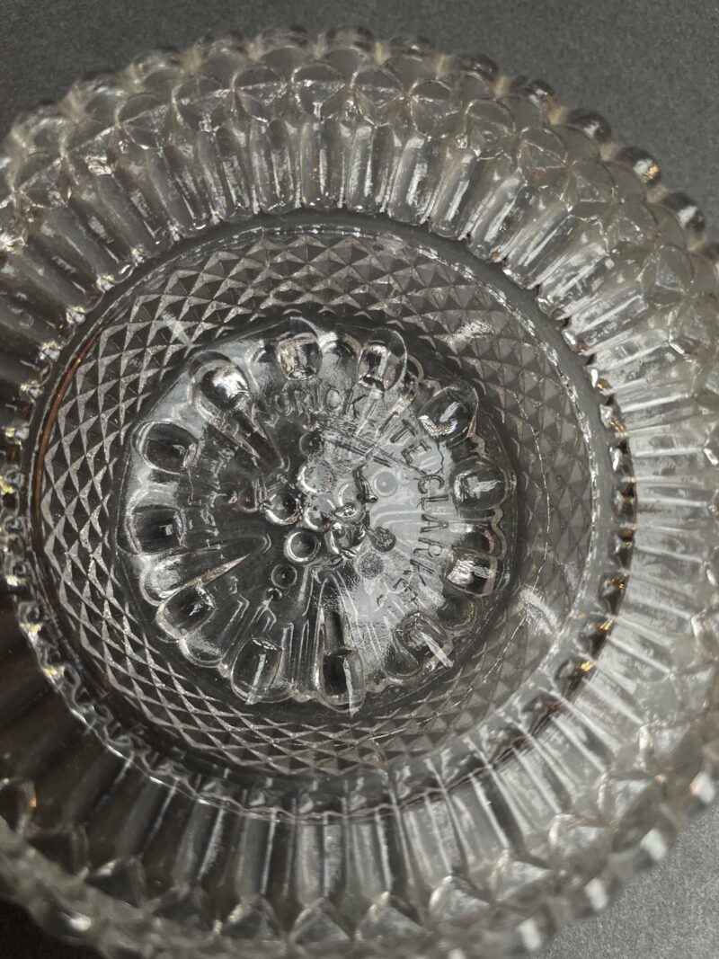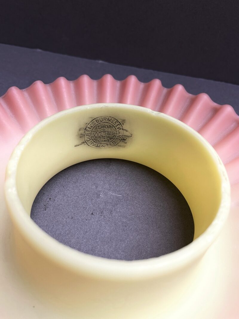 Marked on the interior rim of the cylinder saucer centre, on one side, in circular black overprinted marks, with: ” S. Clarks”, then, “Patent, Trademark, Fairy”. On the opposite side, in the same manner: an outside ring with “Queens Burmeseware Patented” and on the interior, “Thomas Webb and Sons”, c. 1887 (pictured).