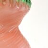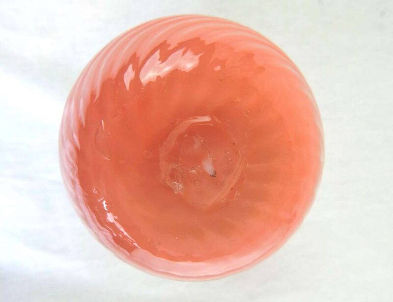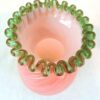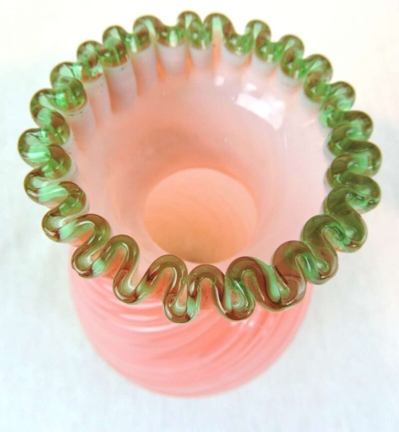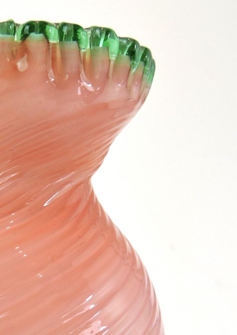 A beautiful Victorian vase in a pink pearl colour with a green crimped rim, it dates circa 1870. It is beautifully glass blown with a continuous swirl and wave pattern. The form is a unique hourglass shape.
