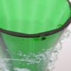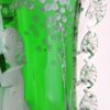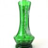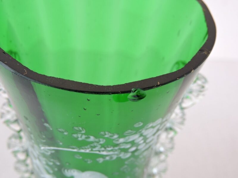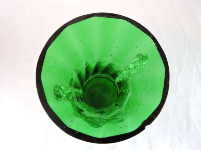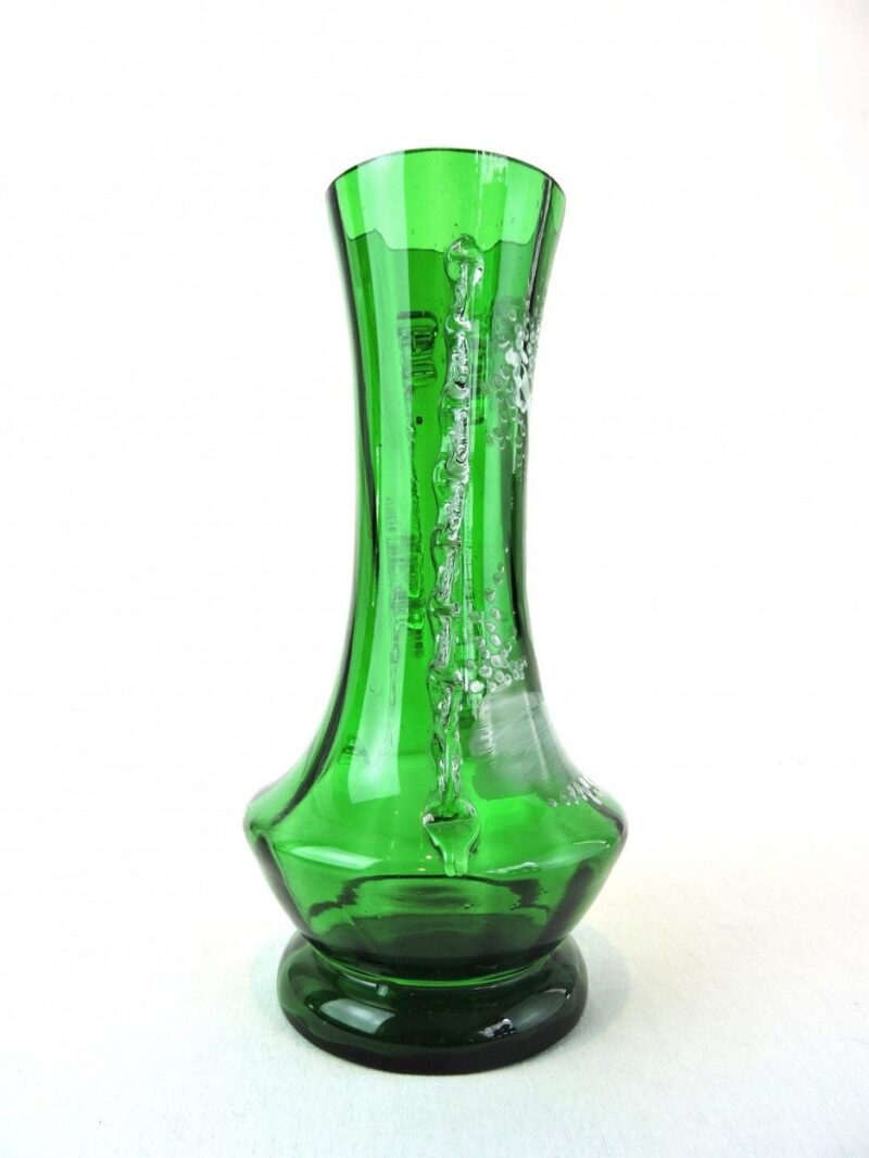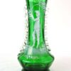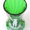 A lovely glass vase decorated with a hand-painted scene by American artist Mary Gregory, it dates circa 1890. The scene painted in enamel white depicts a curious gentlemen arranging a bouquet of flowers. The body is a emerald green and clear glass combination, with a unique, yet sophisticated touch of leaf accents on the sides.