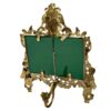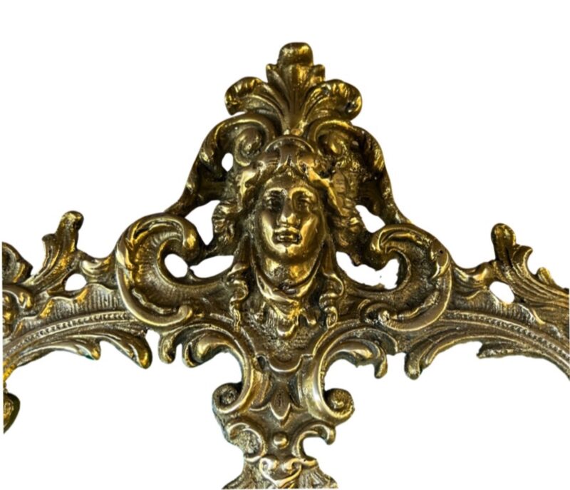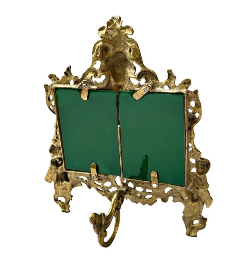 Victorian Rococo cherub double window, table frame in most likely solid bronze due to the weight and polish. Early 20th century in its  Rococo ornate details and featuring figural accents of a centre piece bust and side cherubs. The double picture design accommodates 2 vertical pictures measuring approximately 3×4 inches of visible space. The original pivoting back stand is in excellent shape as is the whole frame and accounting for a slight blemish on one of the cherubs. The stamp N-445 on the metal shows a richness of age and finish that integrates well with any eclectic decor.