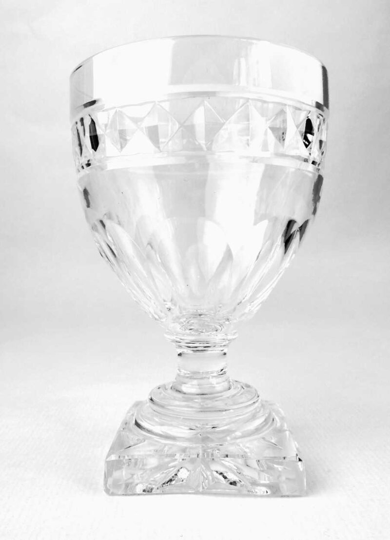 v** SOLD ARCHIVES **vA fine ‘Vintage Cut Glass Square Base Wine Glasses – dating early 20th century. Each is beautifully designed and hand-crafted, with a elaborate ‘criss-cross and petal’ pattern on the body, completed with a intricate stem and square base design. These striking glasses, would make a perfect impact at your next gathering (glasses are limited).