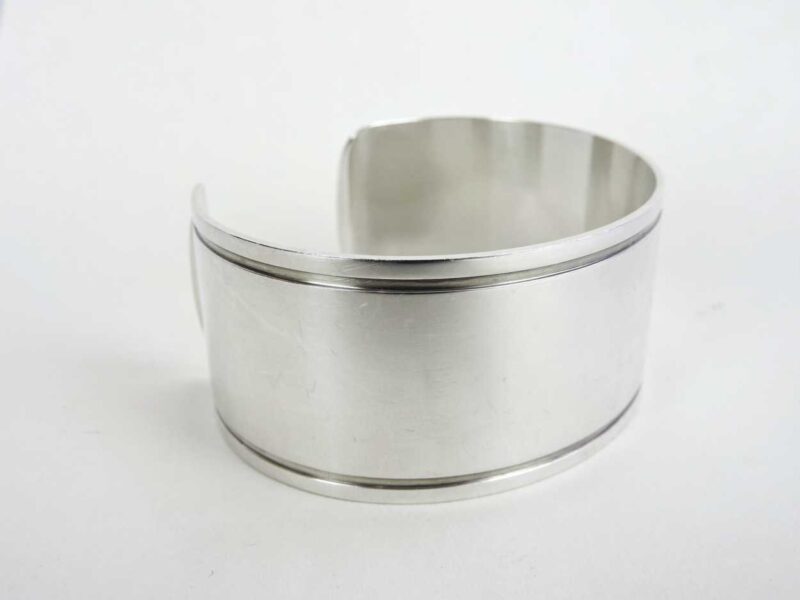 An exquisite vintage Denmark sterling, wide and heavy sterling bangle cuff bracelet, by Georg Jensen. It consists of a simple, yet bold circular design decorated with a single engraved line, possibly ‘Art Deco’ influence. The cuff feature makes it easy to wear, flexible to fit with an effortless style, or fashion.