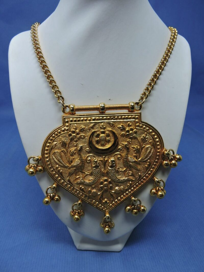 v** SOLD ARCHIVES **vA spectacular gold-tone metal necklace and long chain with a middle eastern design, made by the Hungarian-American fashion designer, Judith Lieber.