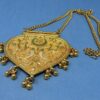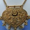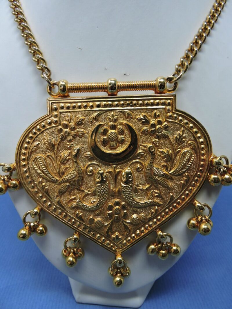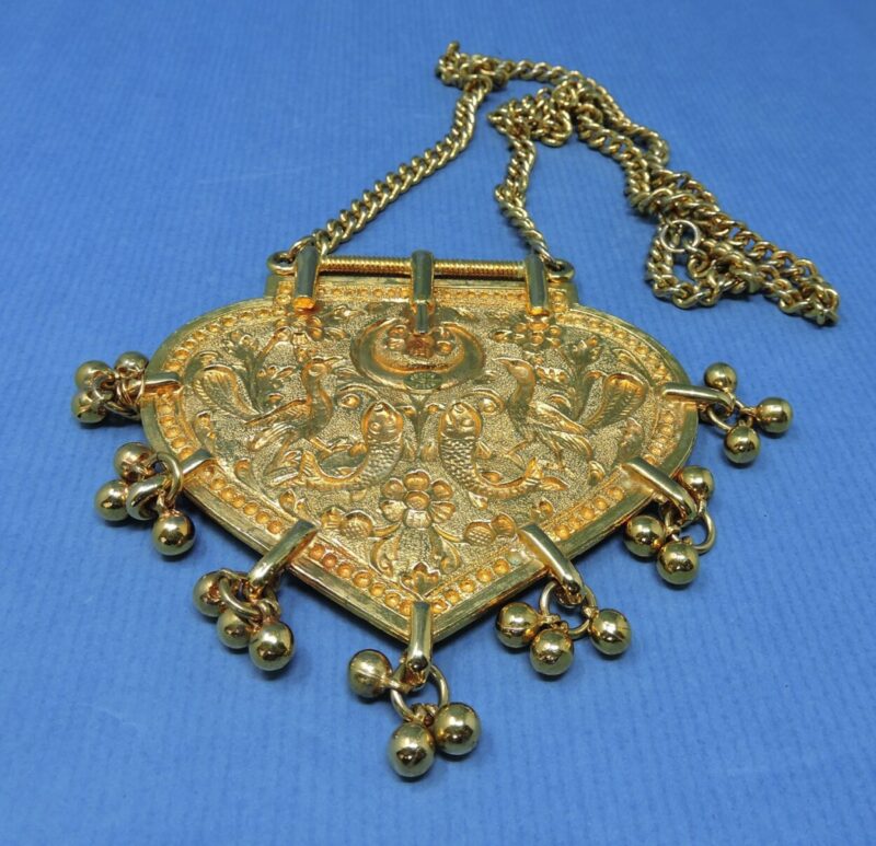 The necklace is embossed with flowers, fish, birds and a cresent moon with dangling gold tone metal balls around the rim of the piece.