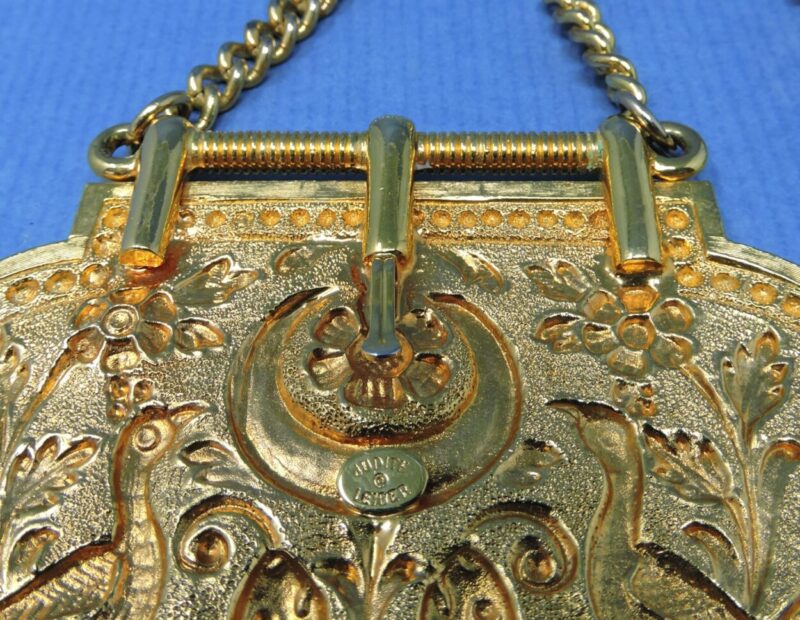 The piece is signed “Judith Lieber” on the back of the central section. With the attached chain, it is 17 3/4 inches long from the tip of the clasp to the bottom of the centre section. It is 5 1/4 inches in width across the centre.