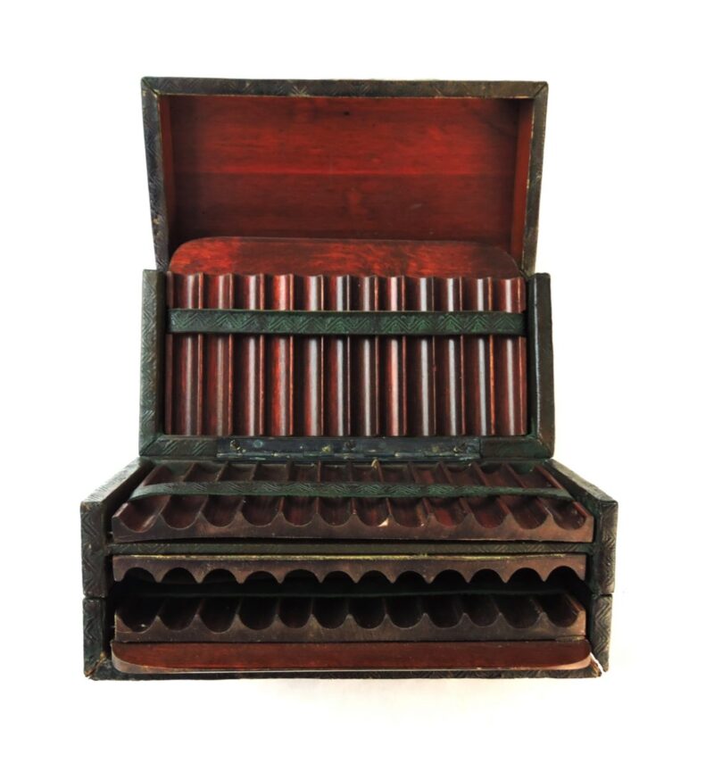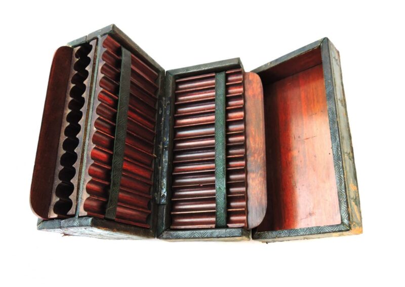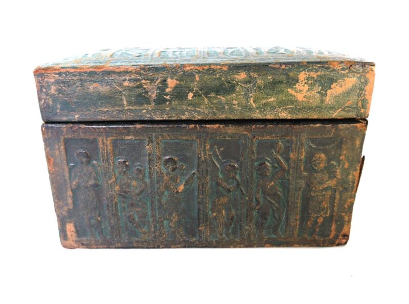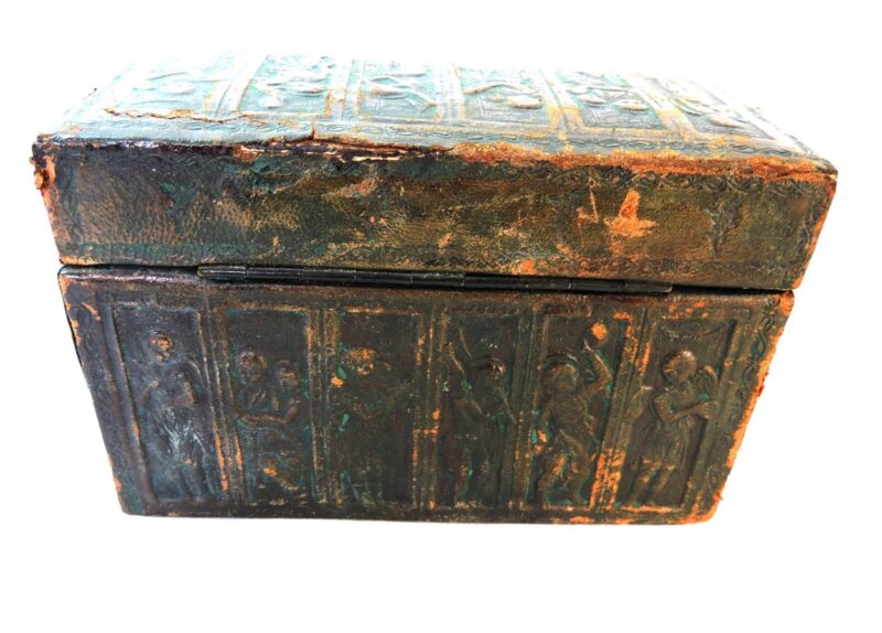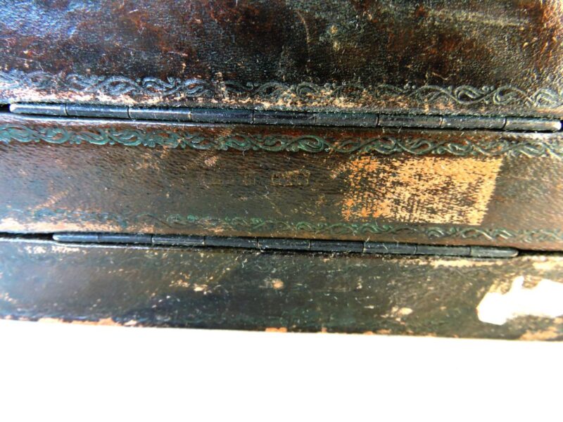 The leather was originally deep green and still show remnants of that colour on the box but age has rubbed some of the leather away.